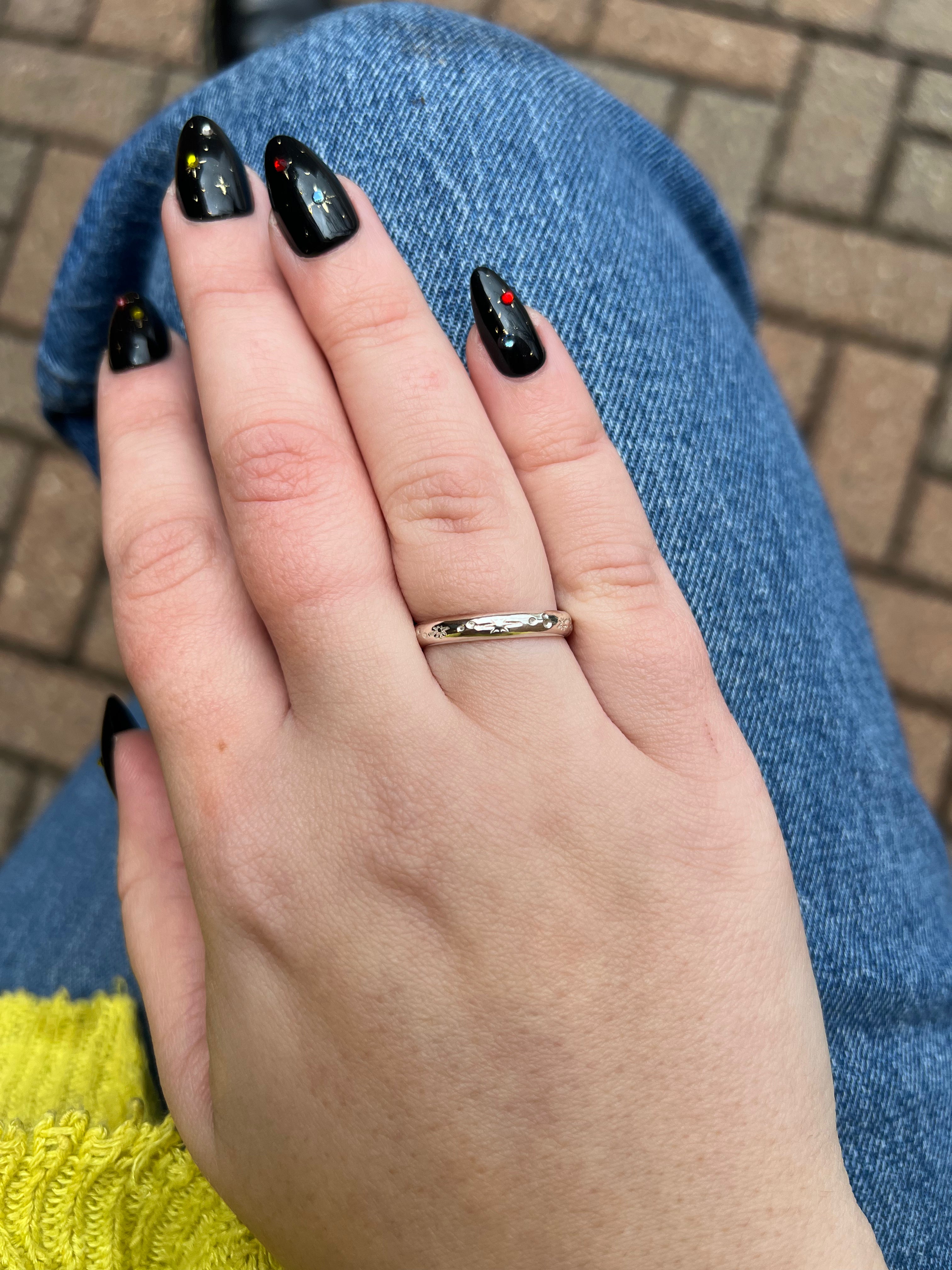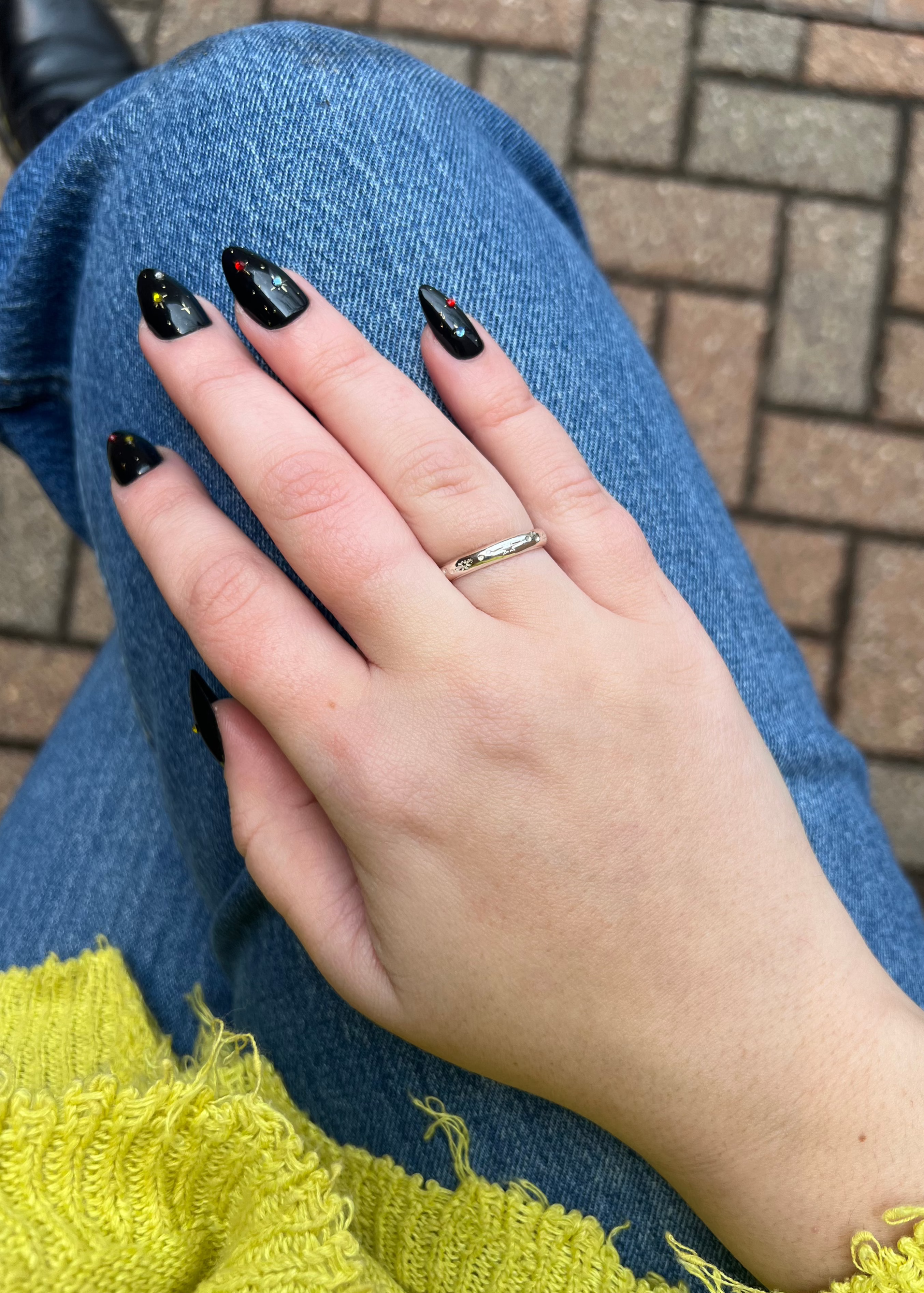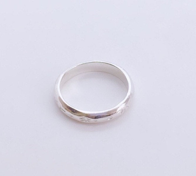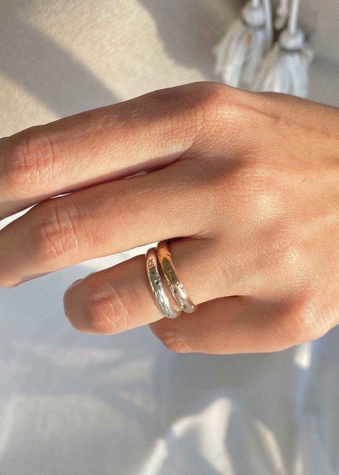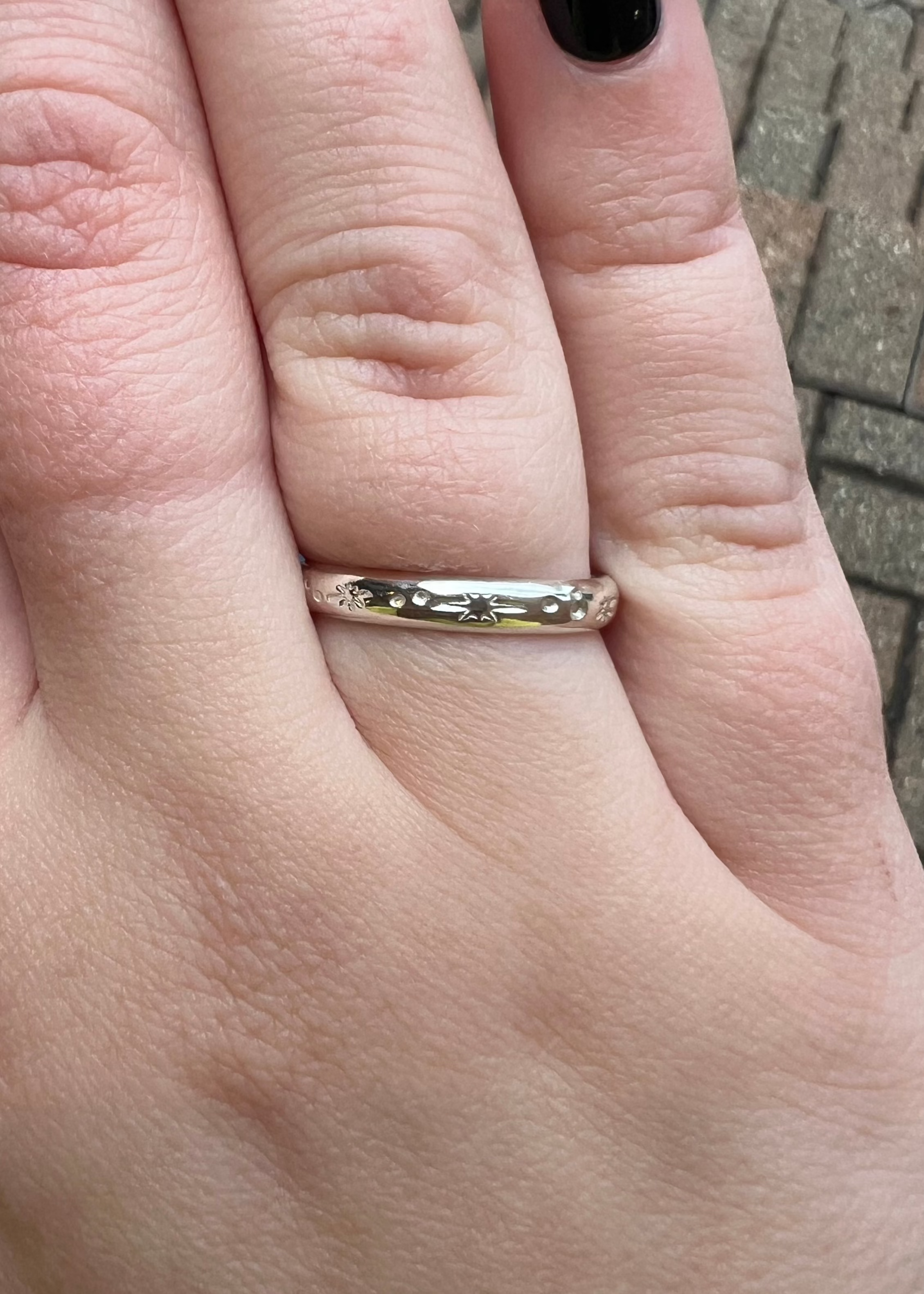 This half rounded thick band is stamped with tiny little dots and sparkling stars creating a galaxy just for you! All the designs are hand stamped, making every piece singular and unique. Because of the handcrafted nature, they may vary slightly. Multiple rings can be stacked together and it looks stunning with other stacking rings to create your particular mix.