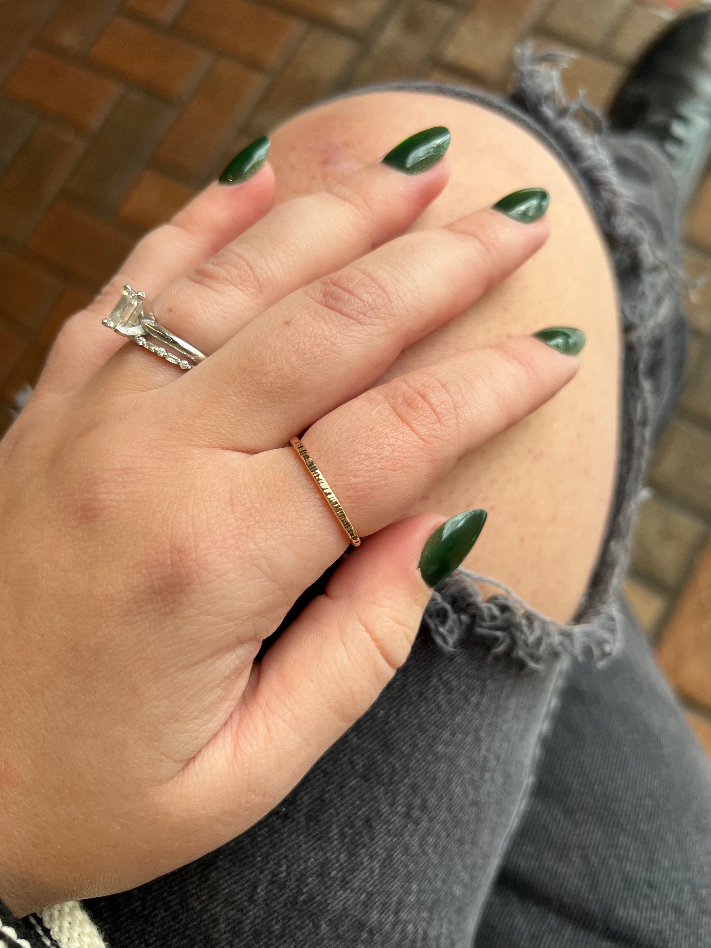 A versatile ring with a glimmering hammered texture, this piece is gorgeous and delicate, ideal to match with different styles of rings. The hammered surface gives an extra shinny effect. The hammered ring can be worn alone, or as a stacking ring, midi ring or thumb ring and are perfect for mixing and matching.