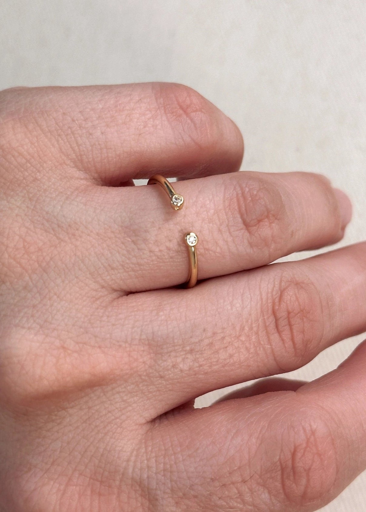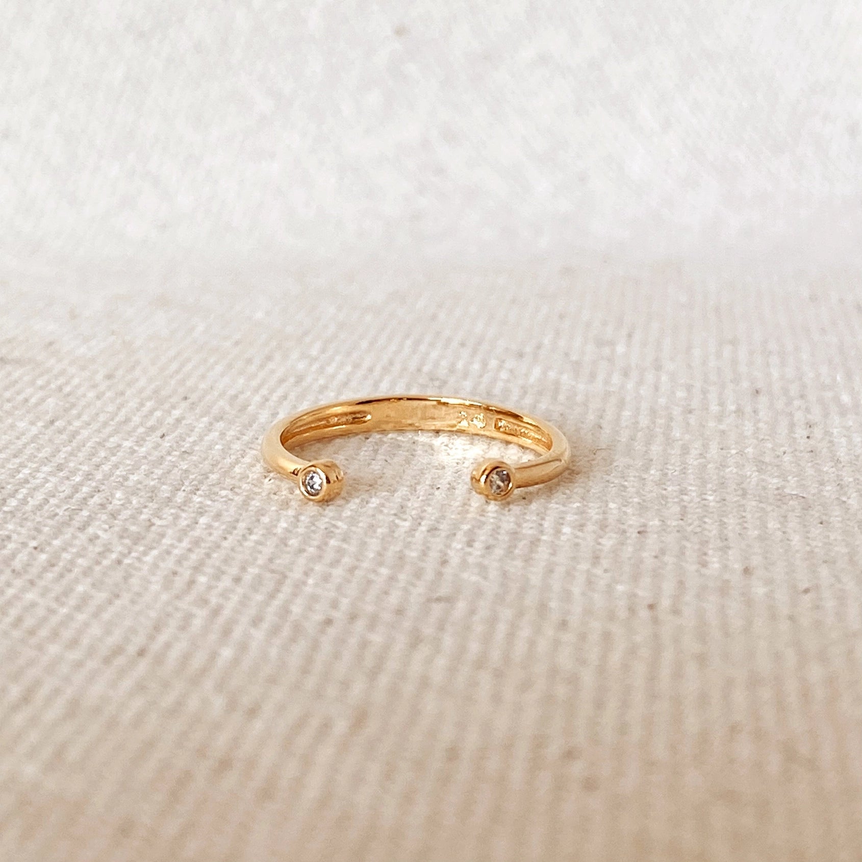 Experience the beauty of this exquisite open ring crafted from the finest quality 18k Gold Filled. Its intricate yet delicate design is perfect for stacking, and it features two cubic zirconia bezel settings that add a touch of elegance.