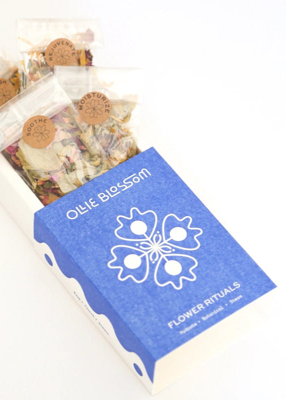 4 Facial Steams in home compostable bags packed with nature's goodness, using the healing power of flowers to gently purify, reduce inflammation, & hydrate your skin, unveiling a nourished complexion.