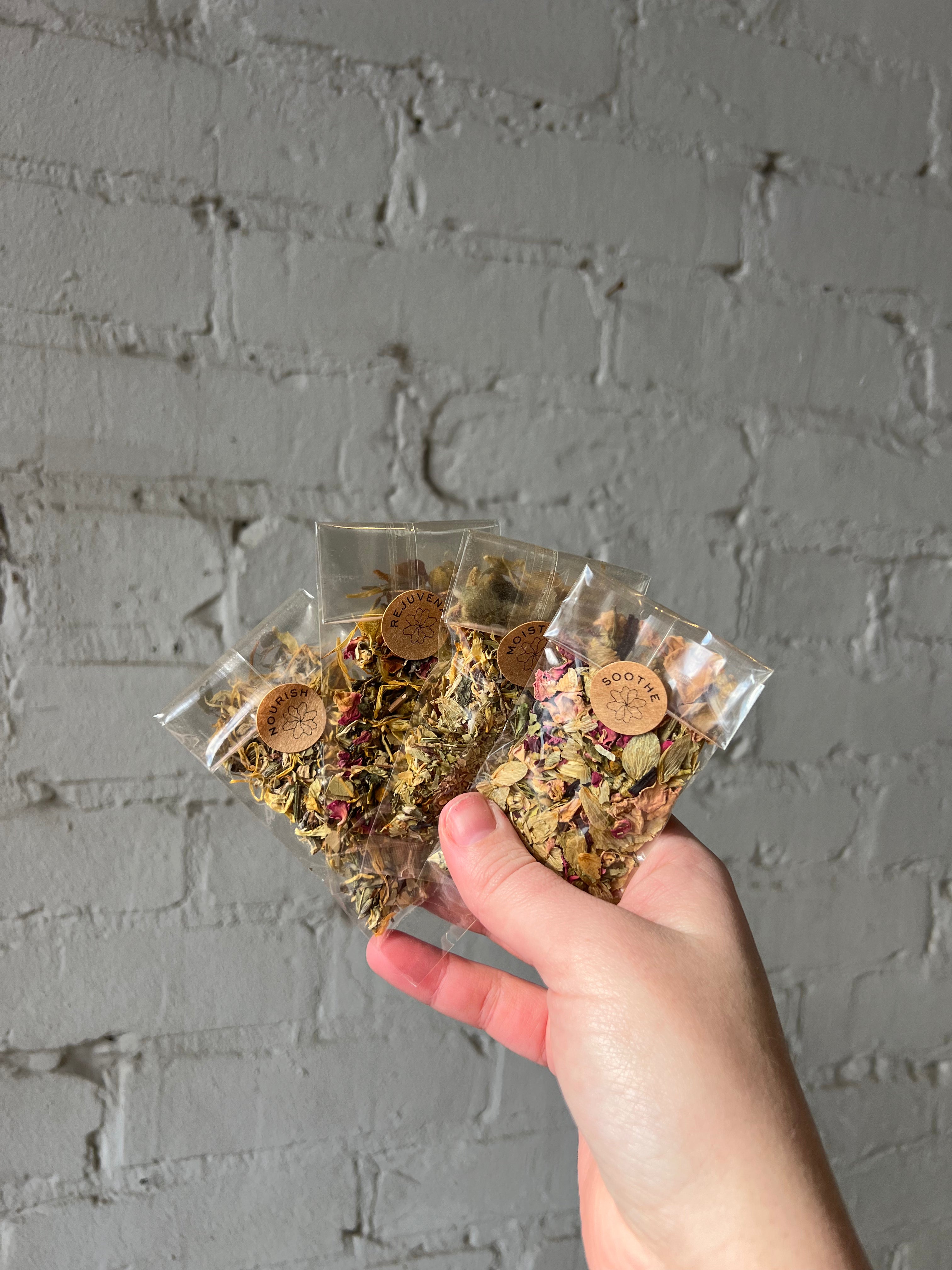 - Rejuvenate: Rose Petals, Eucalyptus, c/s Comfrey leaf, c/s Marshmallow leaf, c/s Chamomile, Marigold (Calendula) * Nourish: Marigold (Calendula), Eucalyptus leaf, Lavender flower, Marshmallow root, Red clover tops, c/s Comfrey leaf, Star Anise * Soothe: Hibiscus Flower, Rose Petals, Hops, Passion Flower, Jasmine Flower, c/s Chamomile * Moisturize: Passion Flower, Marigold (Calendula), Hops, Chamomile, Red clover tops, Rose hips (seedless), Marshmallow root, Lavender How to Enjoy: Pour floral blend into a bowl, cover with 4 cups of boiling water.