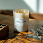 A handmade premium soy wax blend candle with a double cotton wick in a glass jar. Herbal and bright scent in its signature with lavender, bay laurel, lemon + cedar.