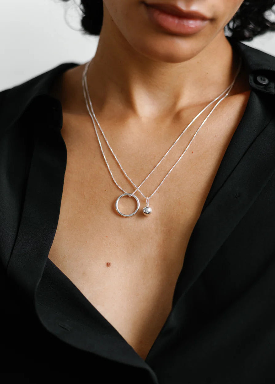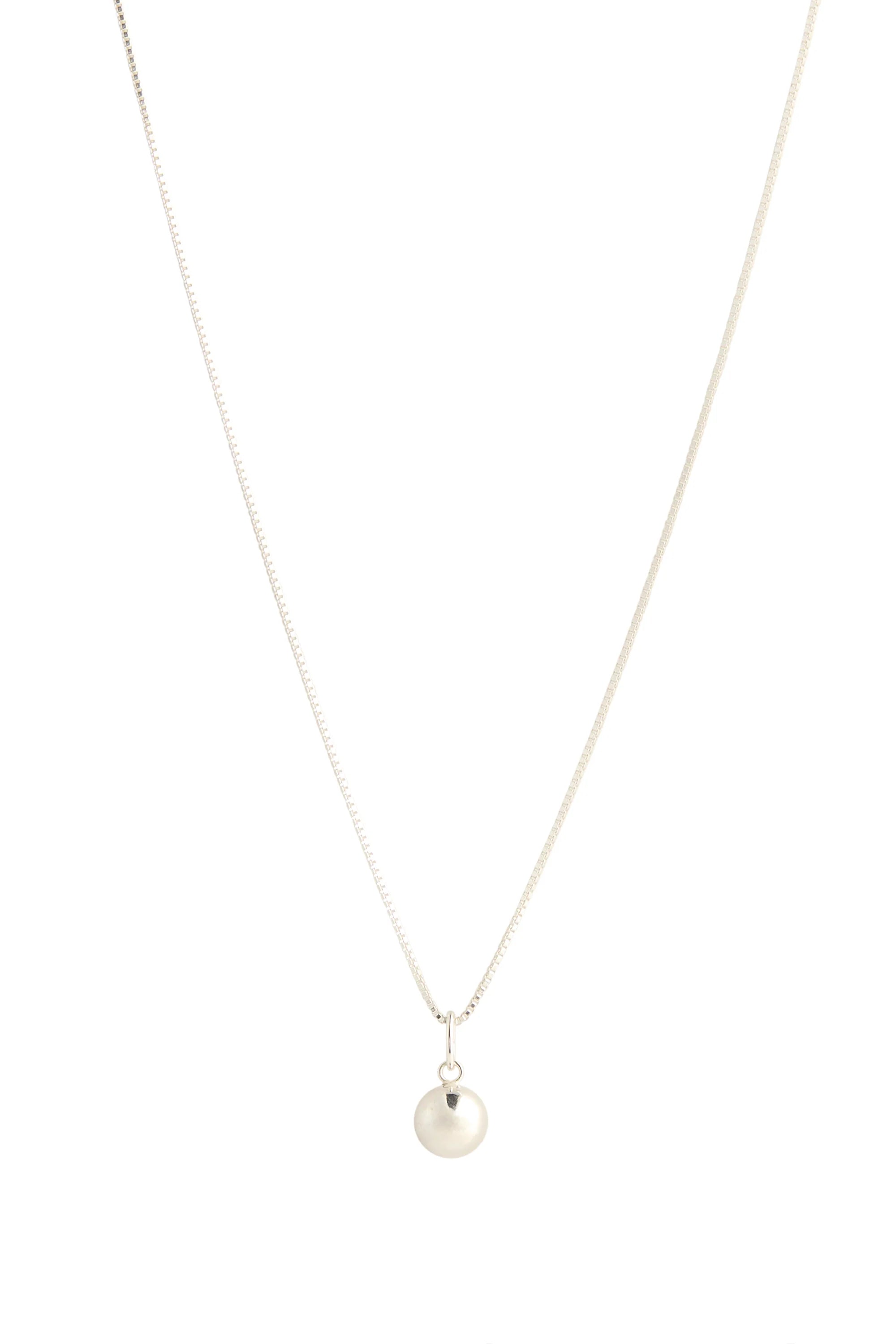 Nevan necklace featured a smooth, sphere pendant hanging from a Box Chain, all made of 14k Gold Filled. A classic, versatile, every day necklace.