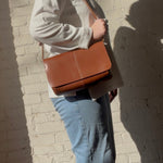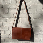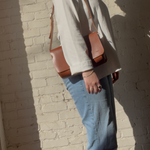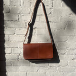 Crafted from smooth, vegetable-tanned natural leather, this crossbody bag features a top flap closure with a contrasting grainy leather lining, a small embossed ‘NIMES’ logo, an adjustable leather strap, and an internal pocket with a leather interior.