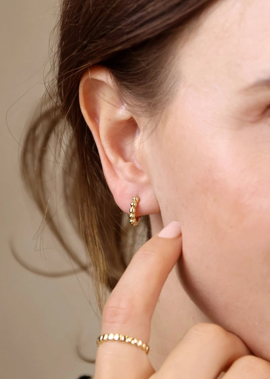 These delicate 18k gold filled beaded clicker hoops combine timeless style with modern convenience. These mini hoops feature a textured beaded design that catches the light beautifully. The secure clicker closure snaps shut with a satisfying click, making them easy to put on and take off while ensuring they stay firmly in place.