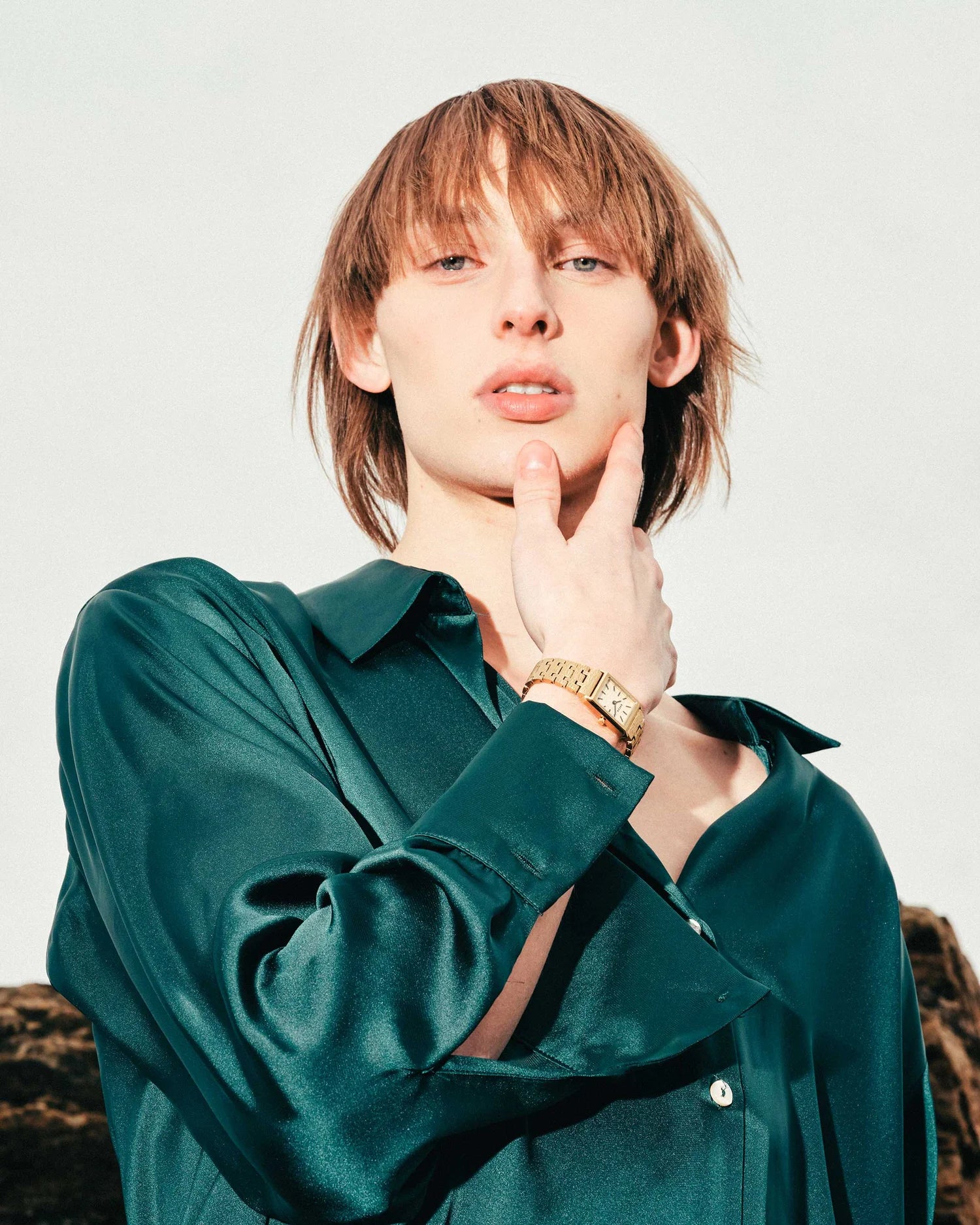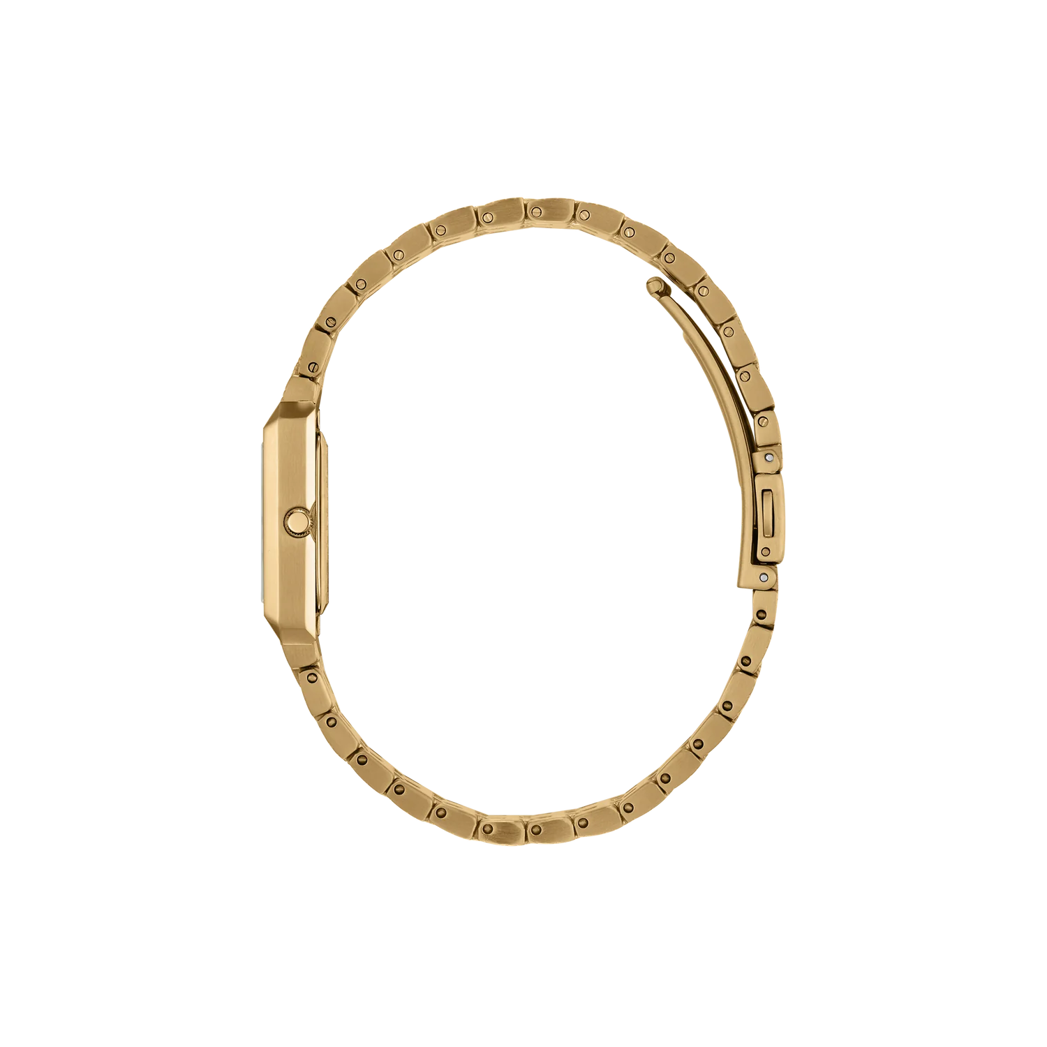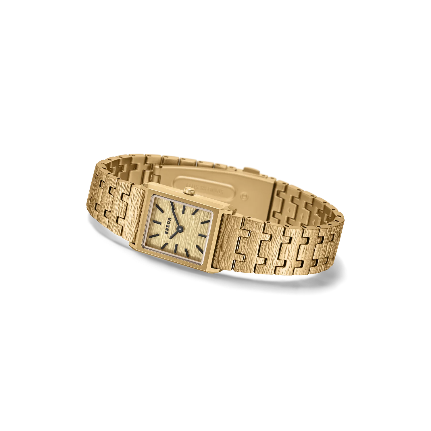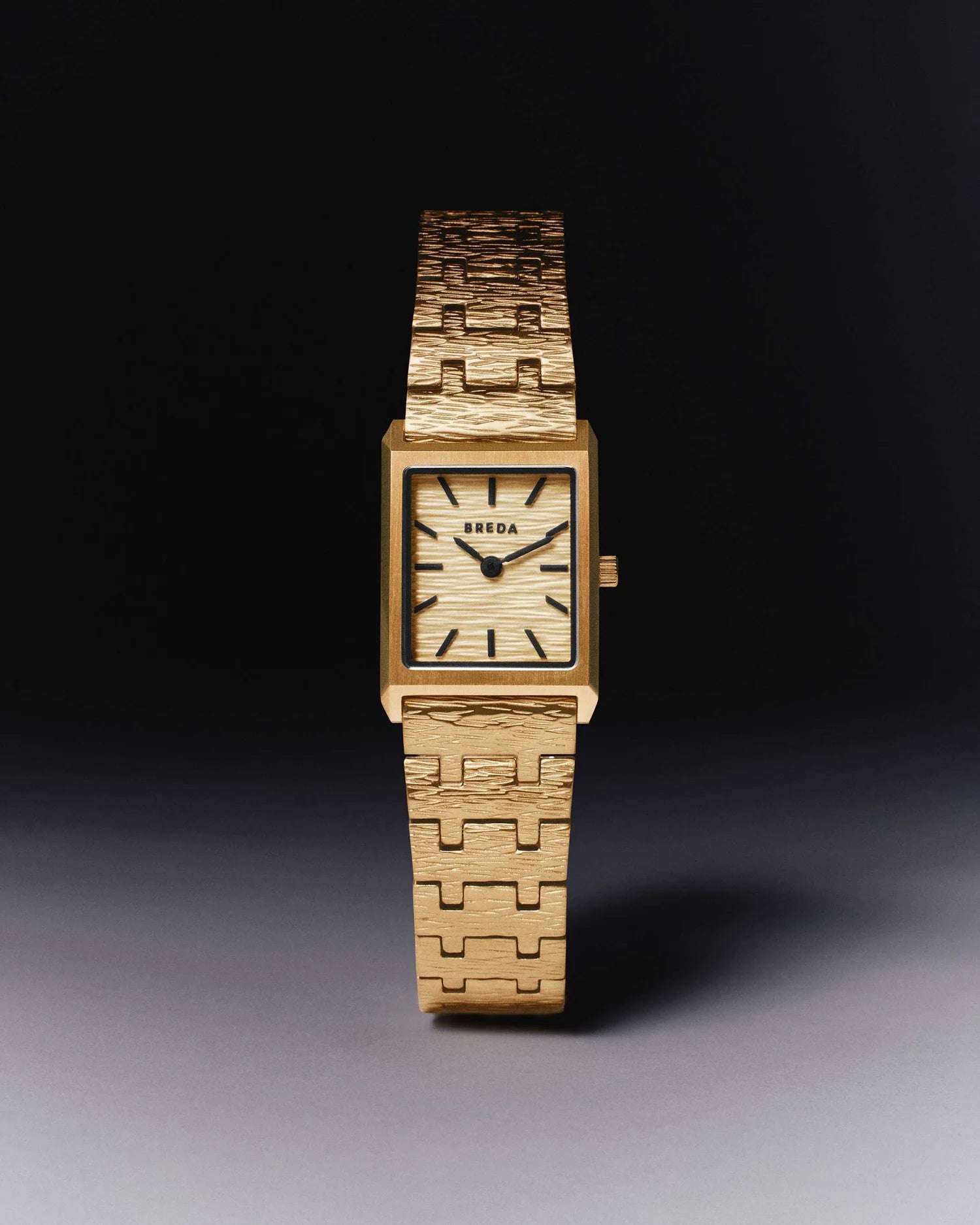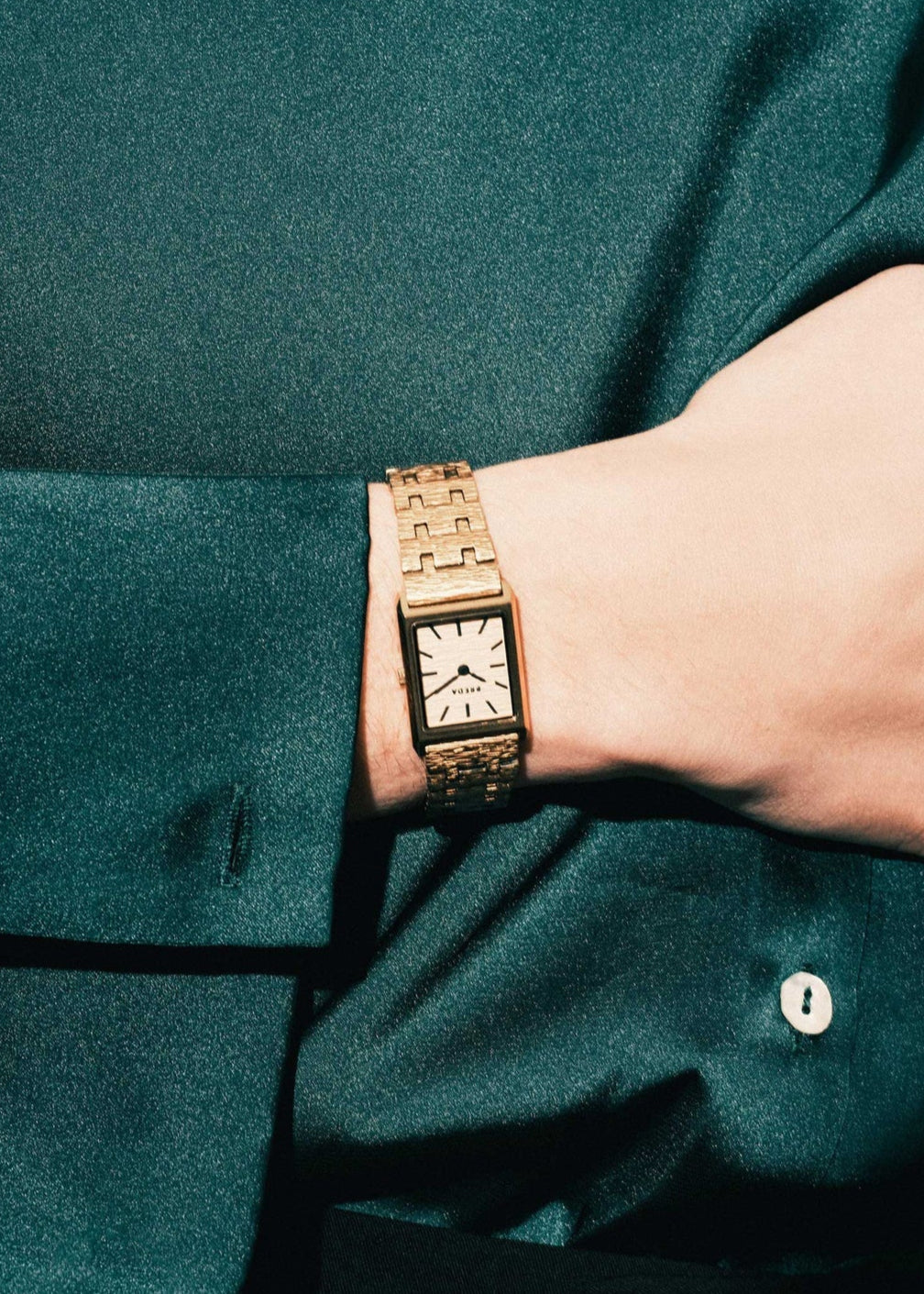 The Virgil watch serves as a powerful reminder of our inherent ability to shape-shift, to reinvent ourselves, and to pivot towards higher purpose guided by instinct. The Virgil (Revival) carries a slender rectangular 20mm case, a gold dial with intricate texture that carries through the bracelet etched in a deep, 18K gold plating and fastens with a push release clasp.