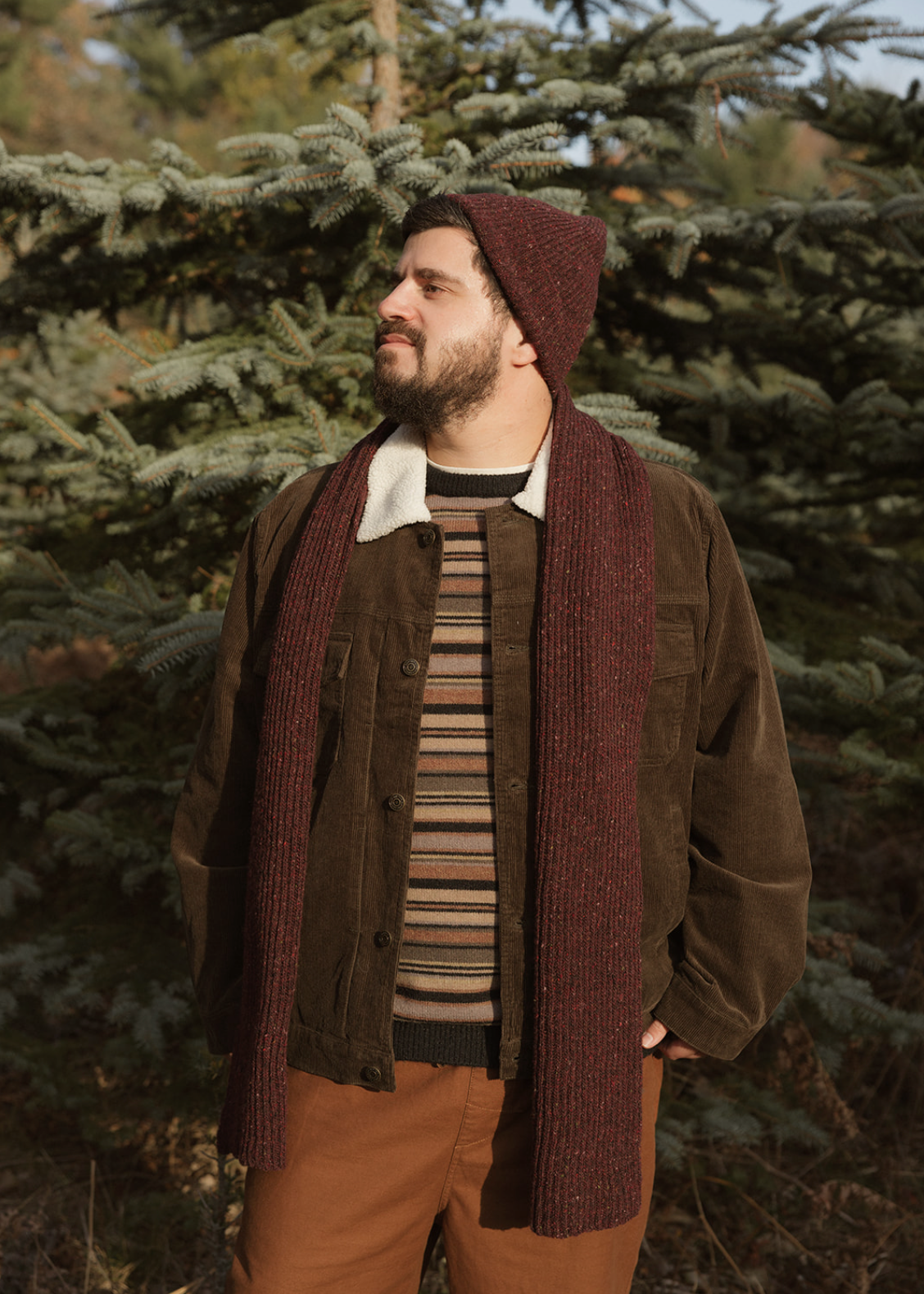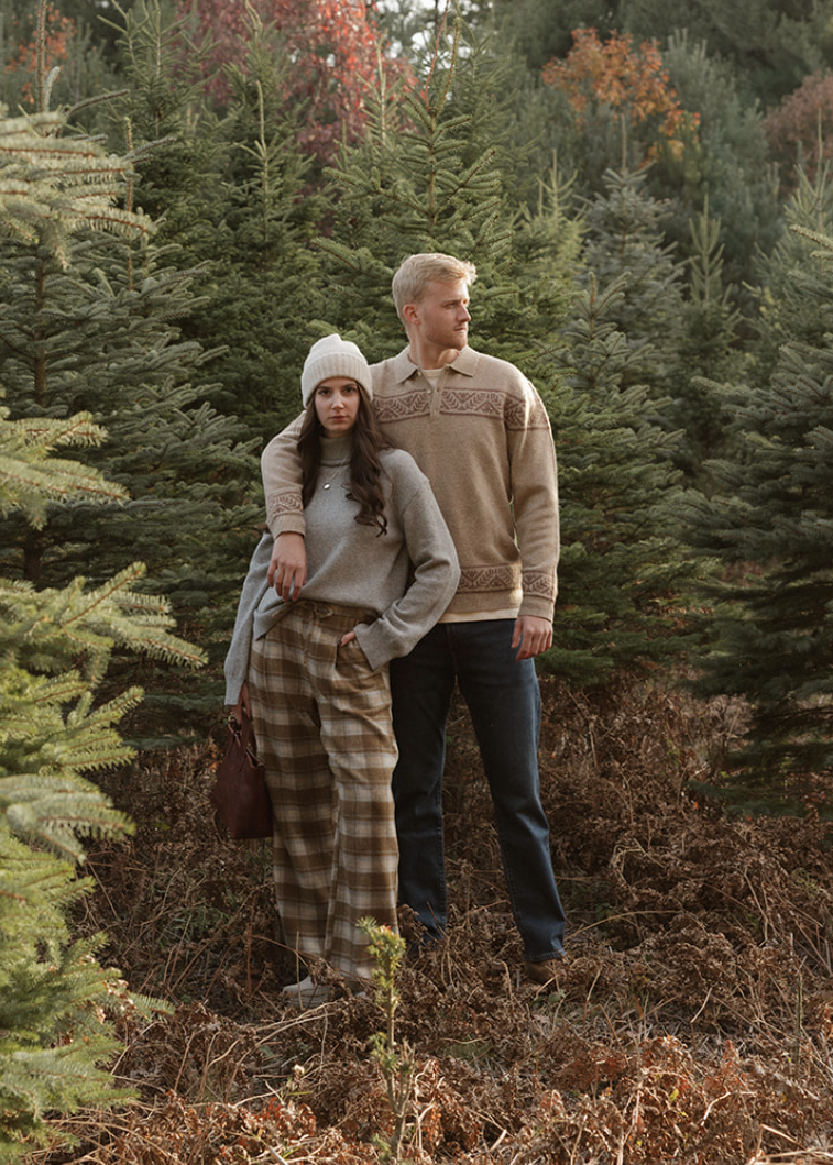 Man wearing a beige knitted sweater with patterned details against a plain background