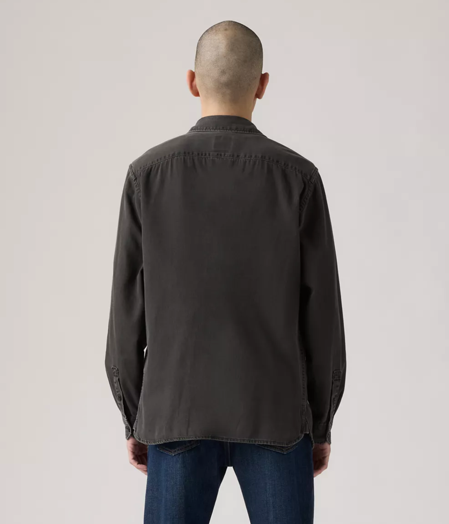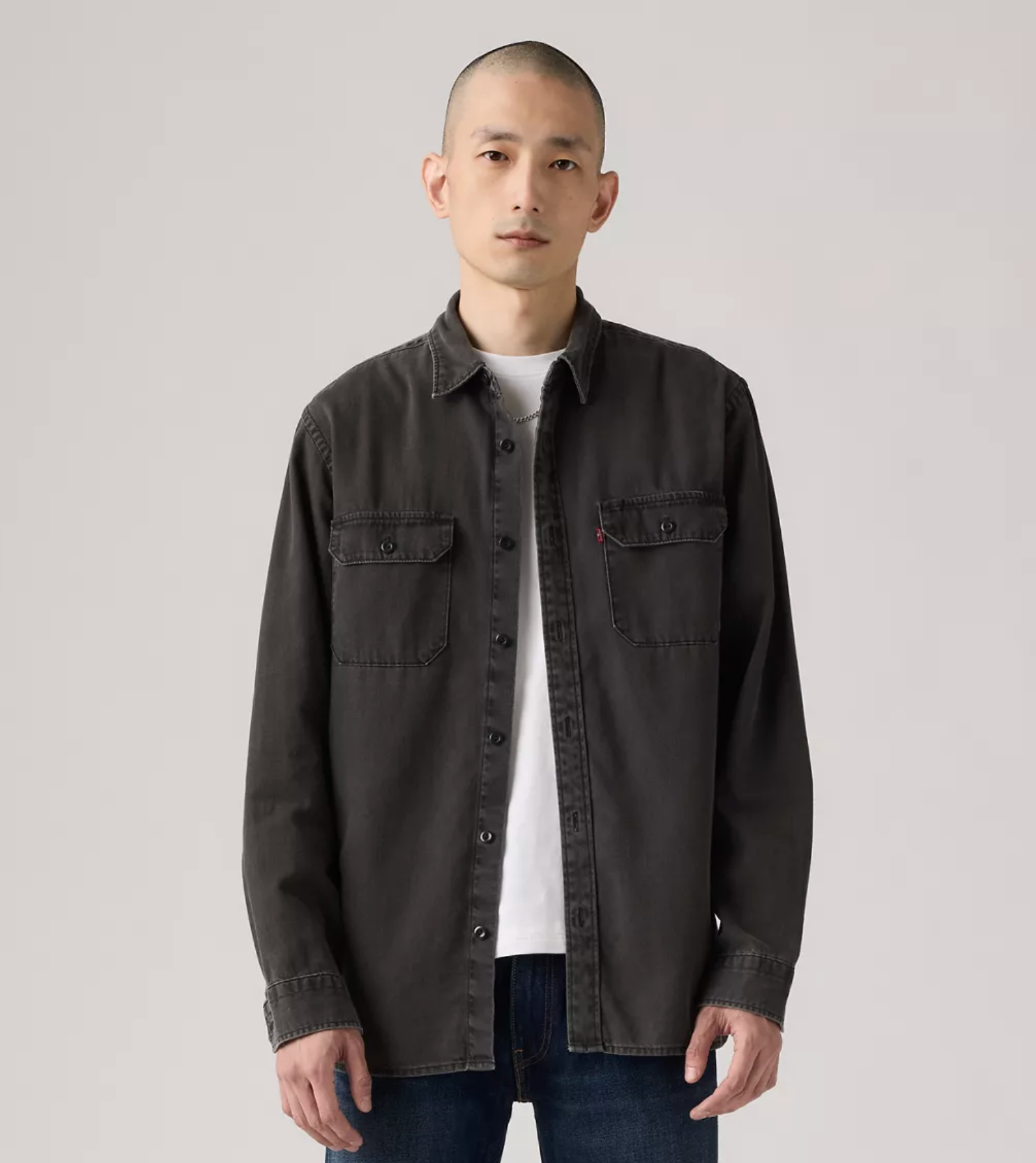 Man wearing a black jacket, white shirt, and patterned scarf in an indoor setting