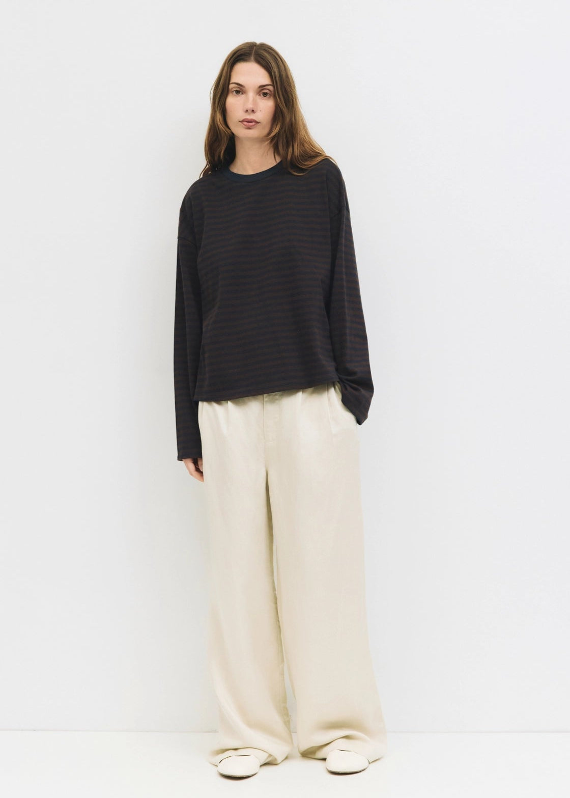 Woman wearing a red sweater and blue jeans standing next to a wooden ladder indoors.