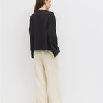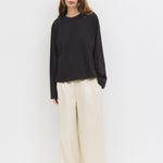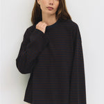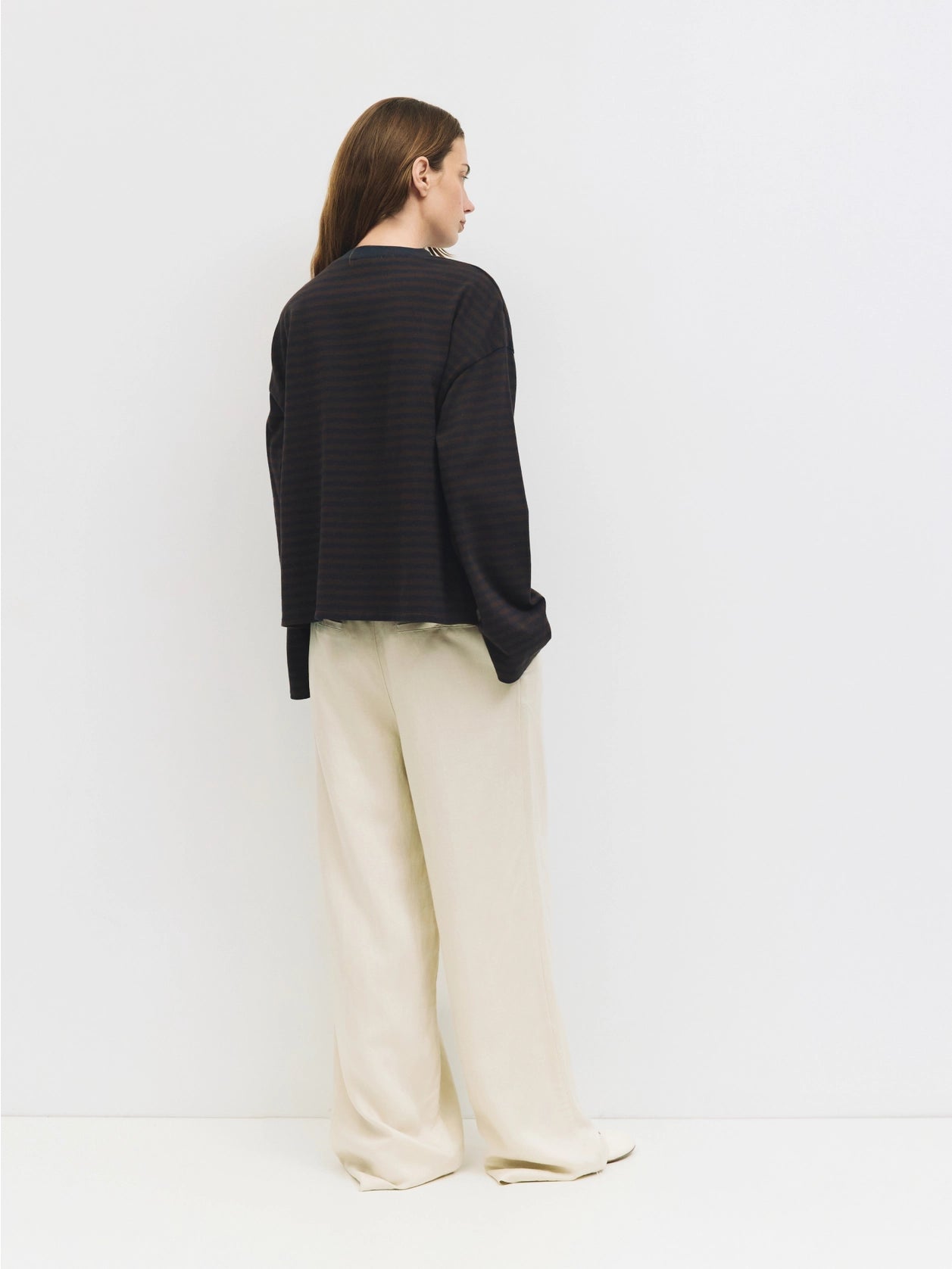 The Callahan Top is a relaxed-fit long-sleeved tee made from midweight striped fabric. It features a solid color crewneck and drop shoulders for a casual, comfortable look. A versatile essential for layering or wearing on its own.