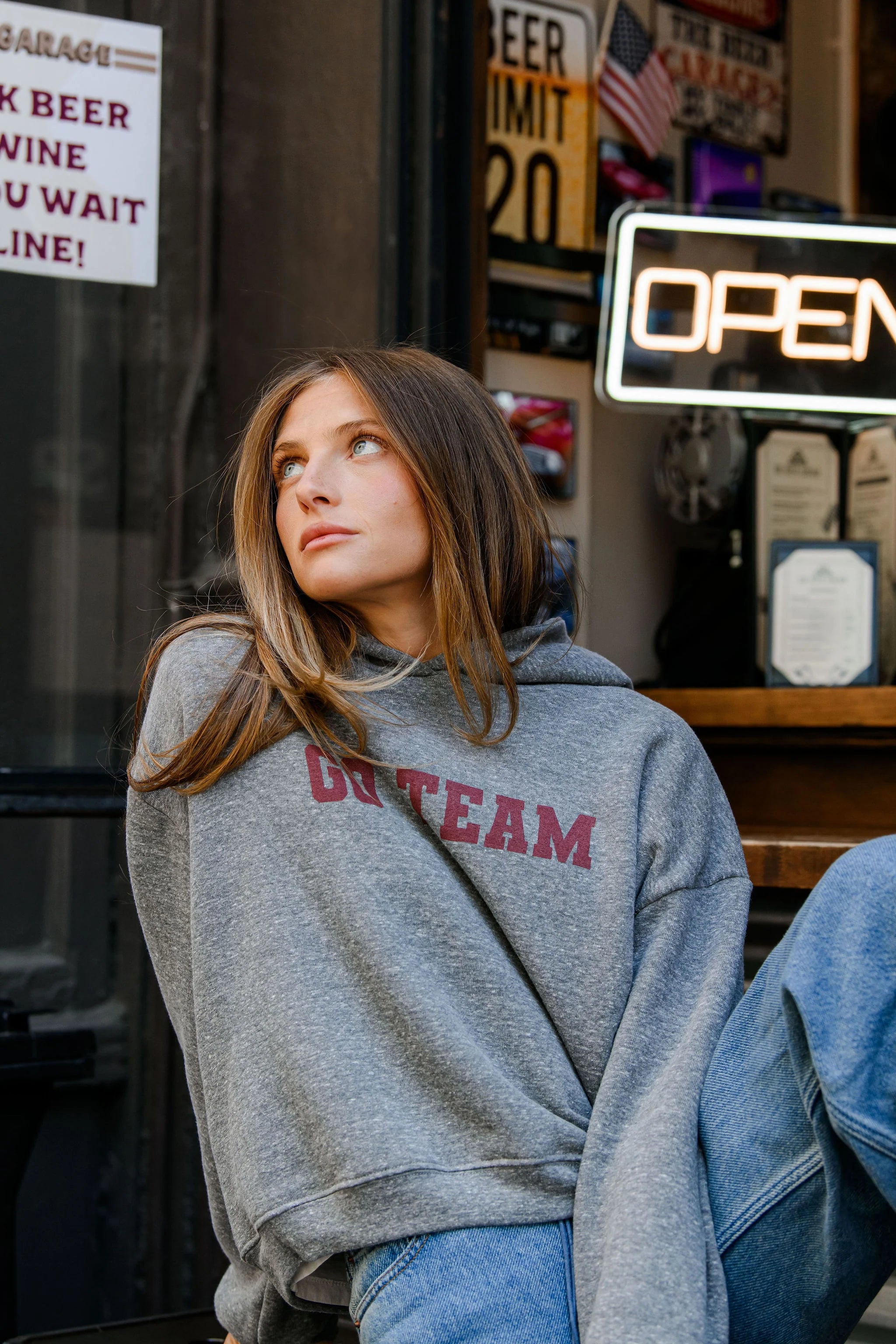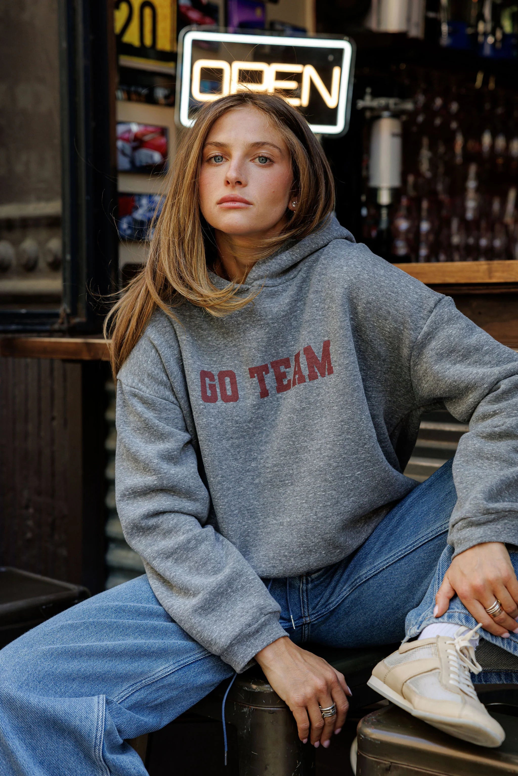 Classic Hoodie features a relaxed, easygoing fit with a slightly cropped hem that hits just right at the waist. Made for comfort and everyday wear, it’s designed with dropped shoulders and a soft hood for that effortlessly cool, lived-in feel. The Go Team hoodie delivers laid-back, slightly ironic charm. Like something borrowed from an old school locker room and made your own. It’s cozy, cool, and made for slow weekends, late night takeout, or just showing up with quiet confidence. No effort, all attitude.
