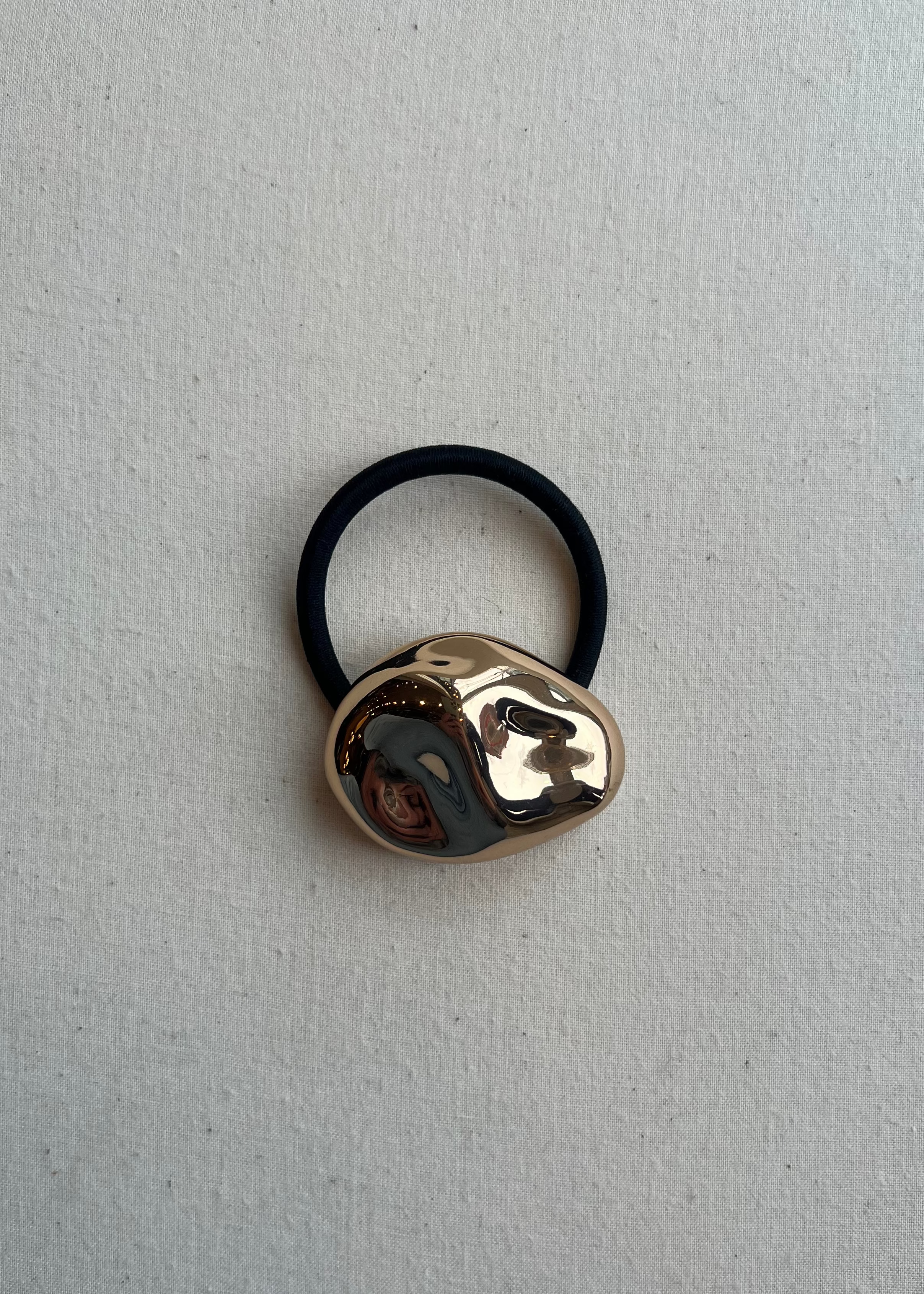 This hair tie features a pebble-shaped metal cuff with a bold, organic design and a smooth, polished finish.