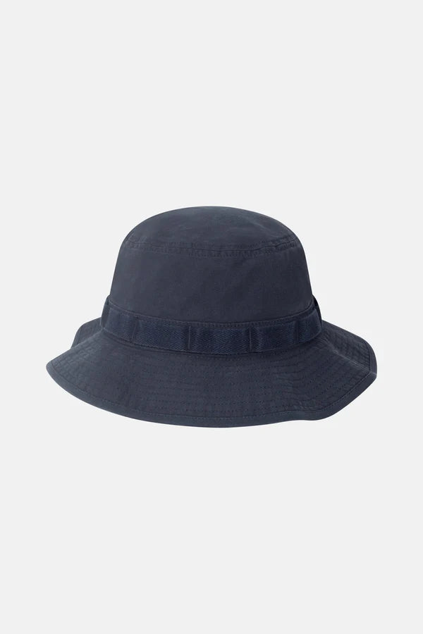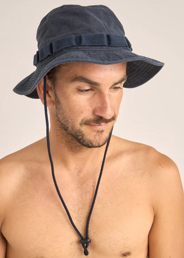 The Navy Worn Path Boonie is built for those with an adventurous spirit. Crafted from durable cotton canvas, it features a structured wide brim, adjustable chin strap, and branch loop detail around the crown. With Rhythm trims for a signature touch, perfect for those who roam and create.