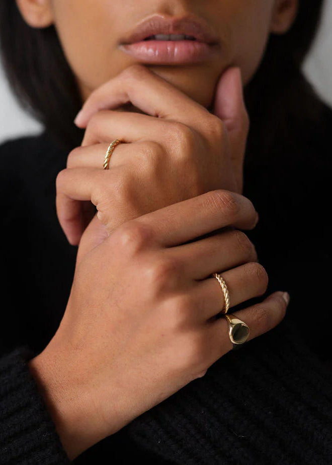 Corda Ring features a twisted rope design with a medium width, measuring 2.5mm. Substantial enough to wear alone but also a great piece for layering piece.