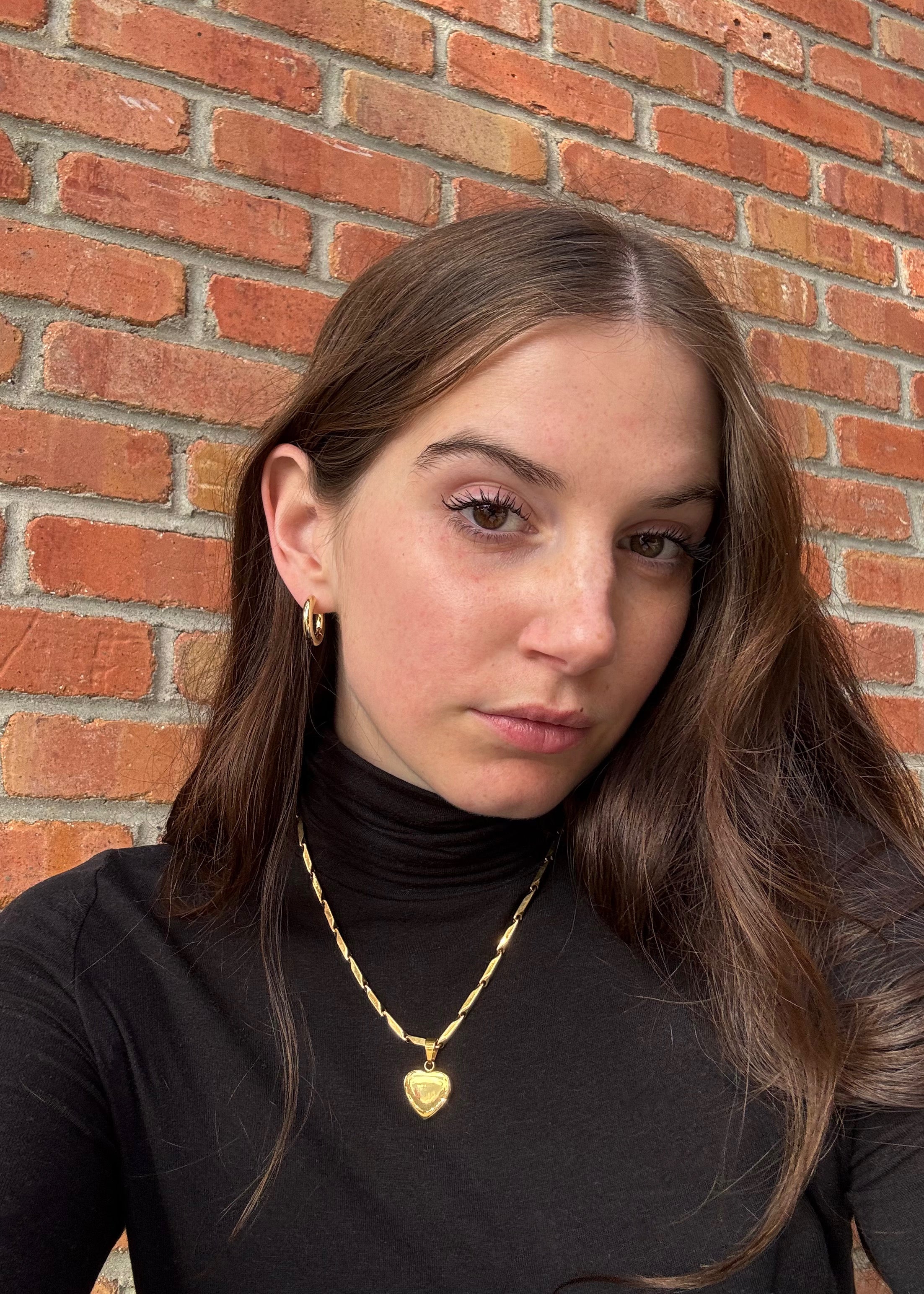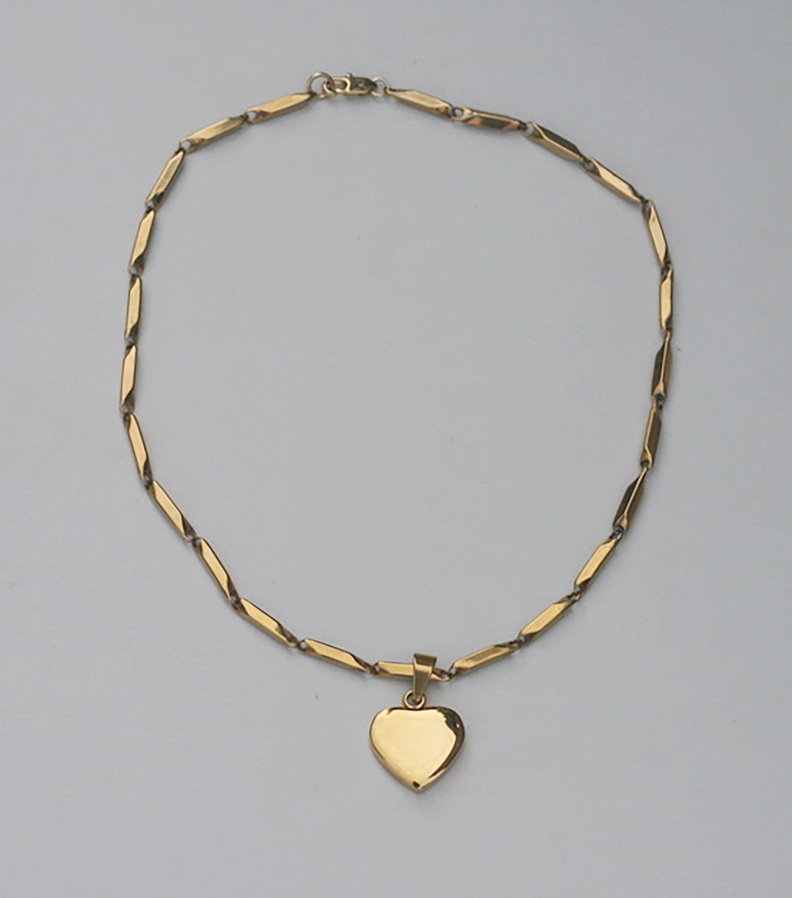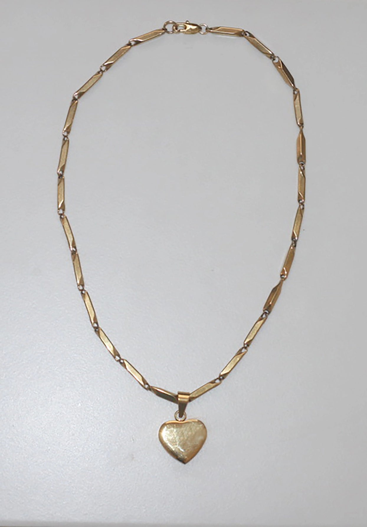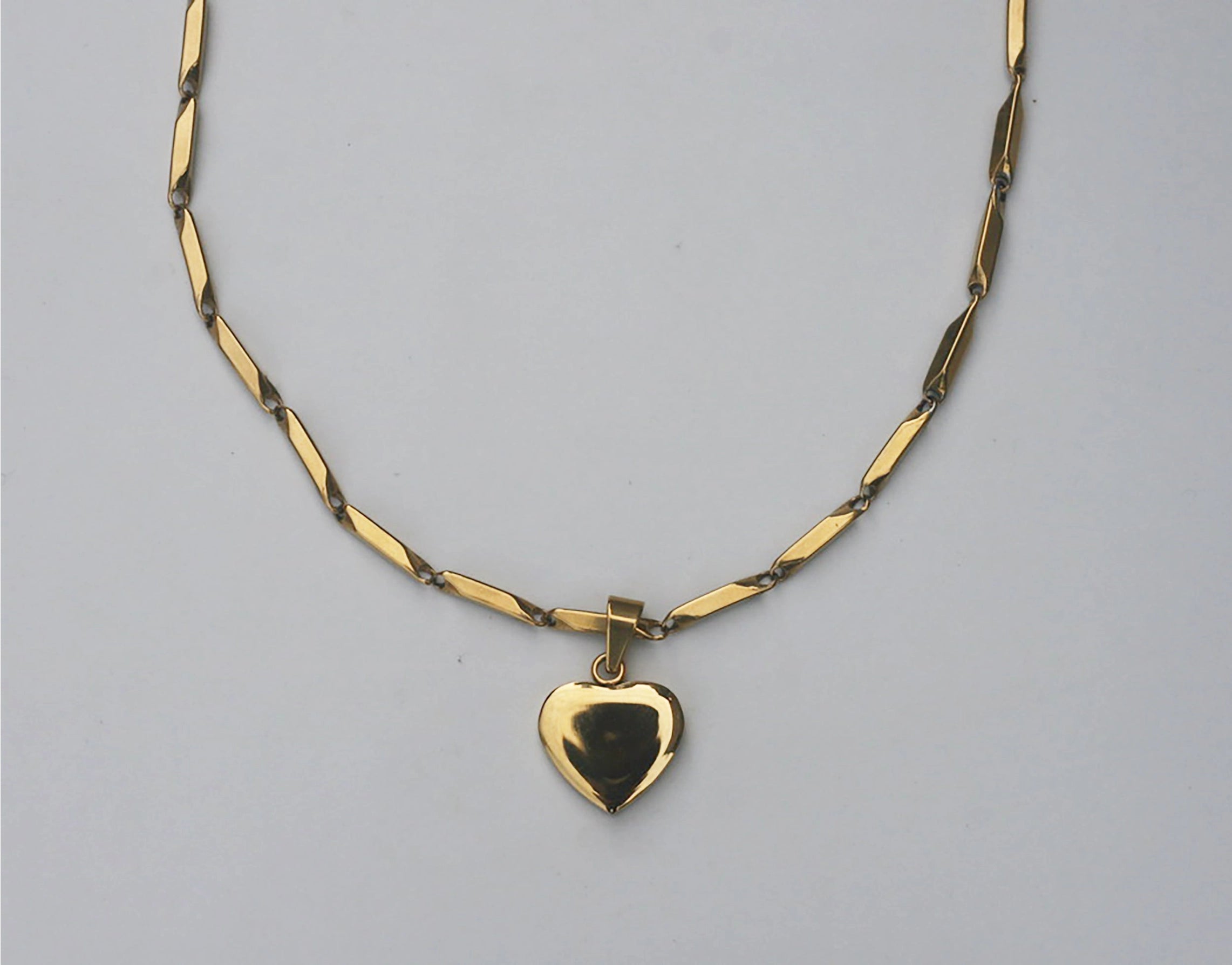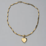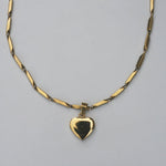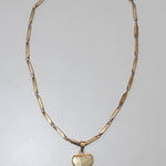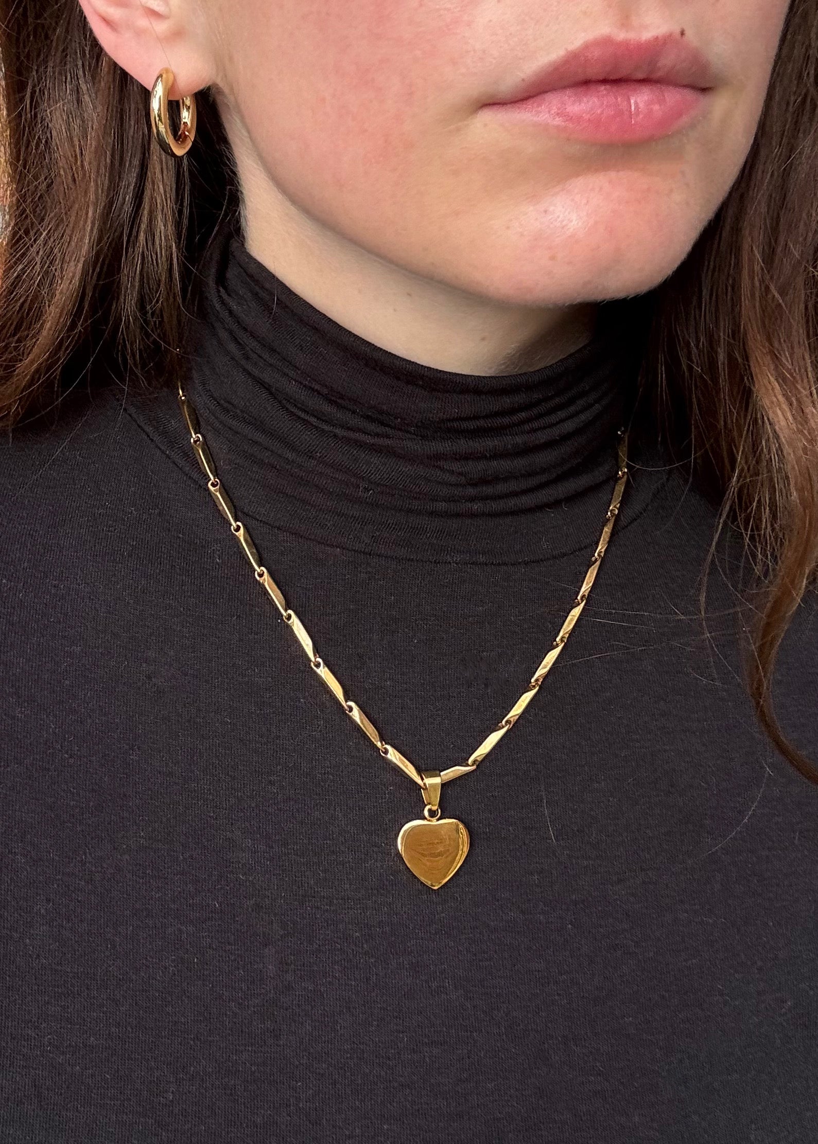 Modern heart charm necklace. This solid shiny gold heart hangs from a unique shiny faceted bar link chain. This smooth rounded heart is a nice contrast to the sharp edged chain creating a sweet and substantial silhouette.