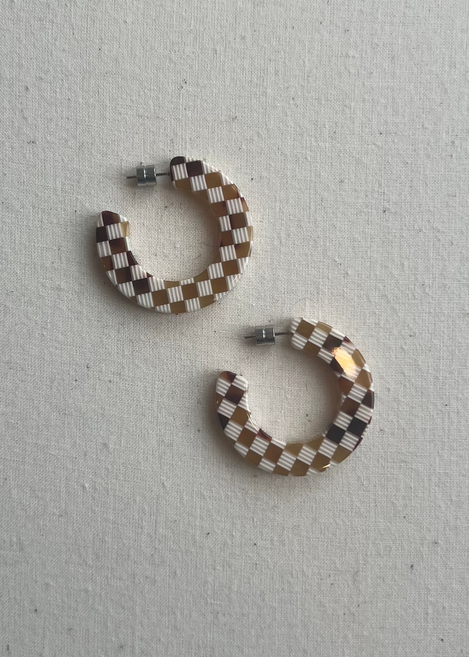 Hoop earrings made from lightweight Italian acetate with engraved barrel backings.