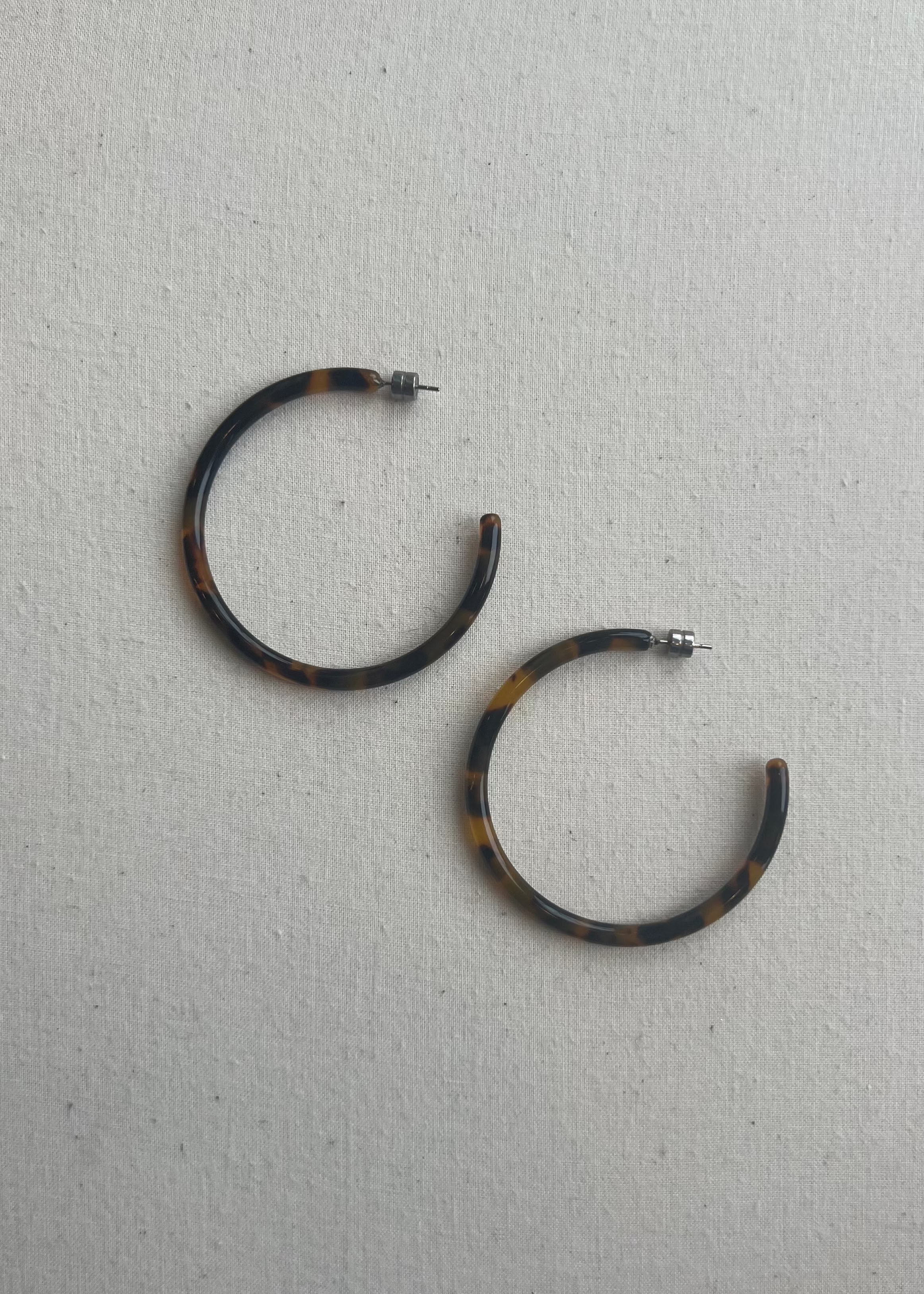 Oversized hoop earrings made from lightweight Italian acetate with engraved barrel backings.