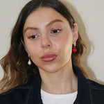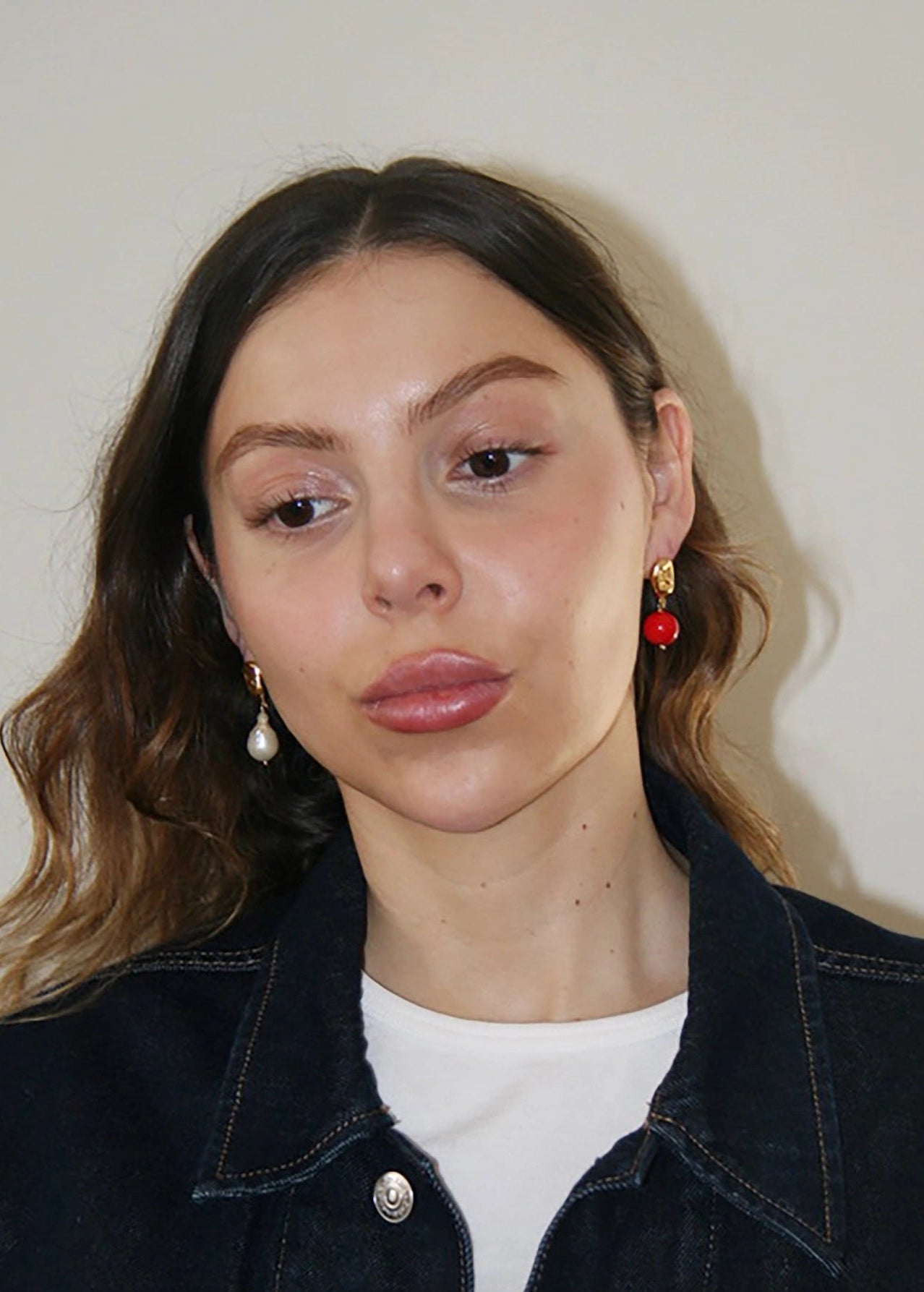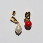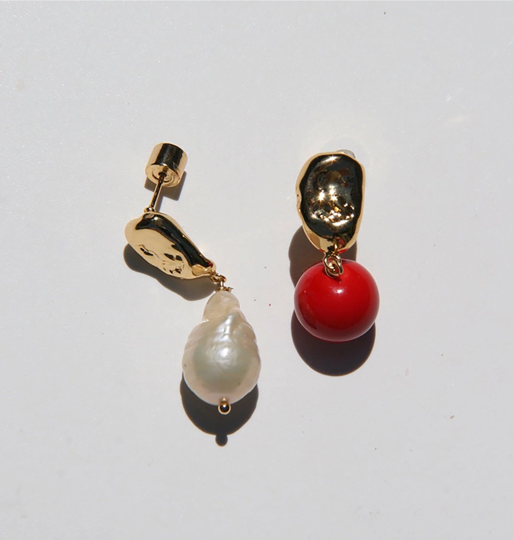 Abstract sculpted posts with mis-matched drops. An organic shaped baroque pearl and round shiny bead for a pop of color.