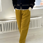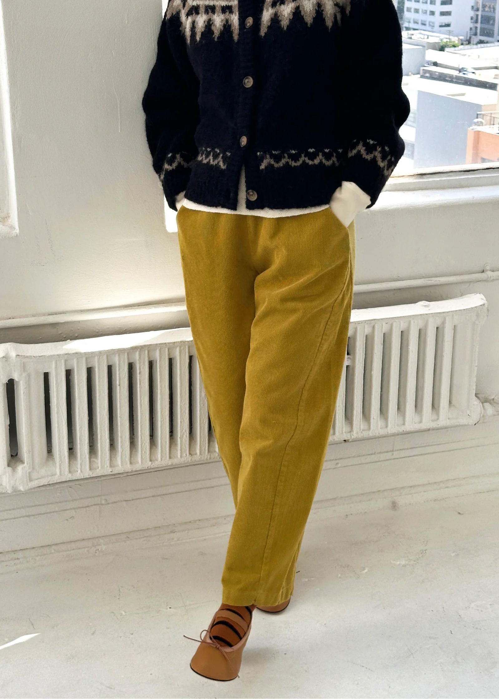 Soft corduroy Arc Pants in a versatile green olive shade. Features a curved, cropped silhouette with distinctive side panels, deep pockets, and an elasticated high waist for comfortable all-day wear. A wardrobe essential that works for any occasion.