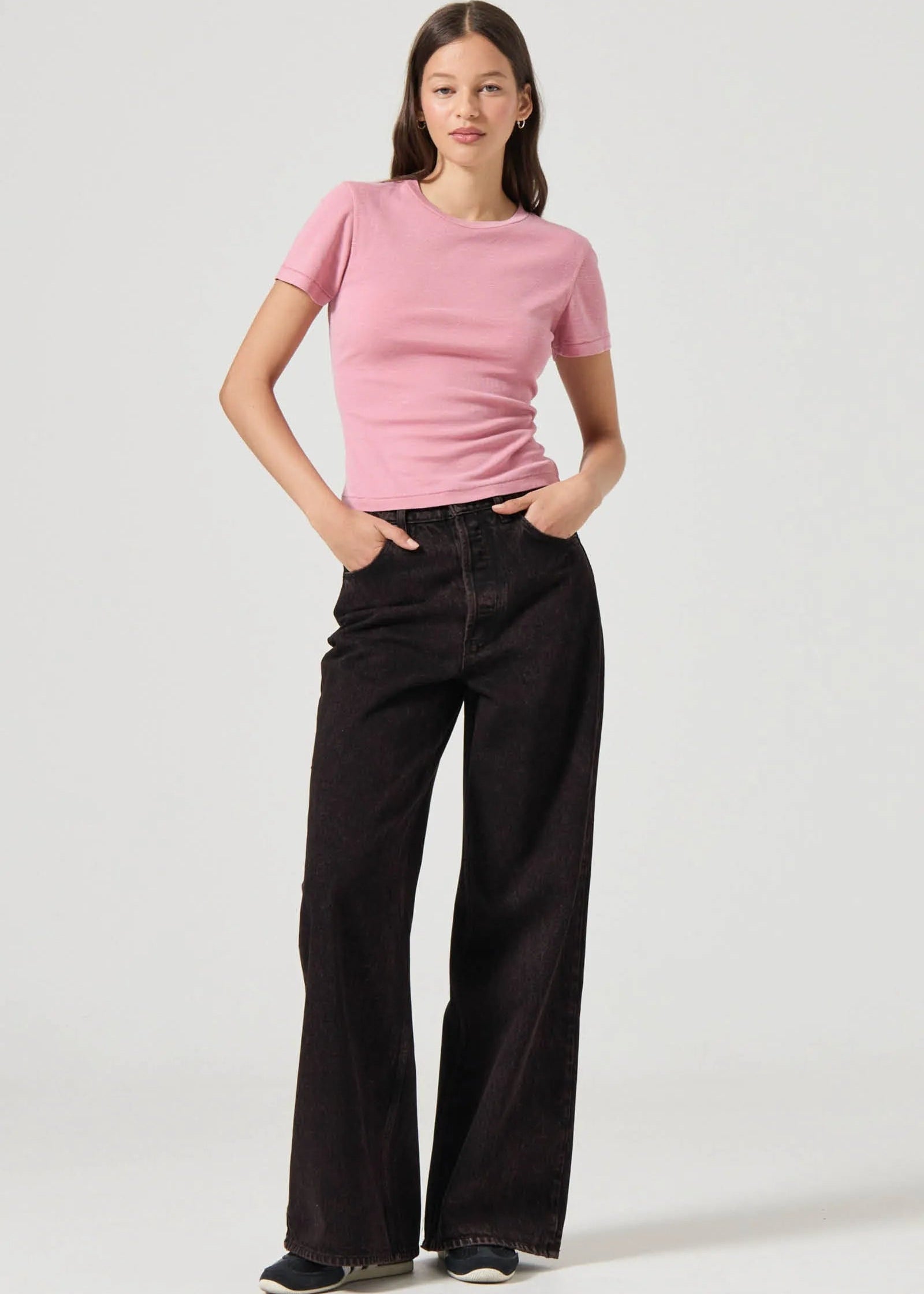 These high-rise pants are crafted from "Chocolate," a black denim with a rich chocolate tint, and made with rigid, non-stretch denim that holds you in for a flattering fit. Featuring a relaxed fit with a flared leg and long length, they are a button fly. The tonal stitching and vintage gold logo button add timeless style, while the signature back pocket stitching completes the look. Keep in mind, they may feel tight when first worn, so if you usually wear super-stretchy denim, you might want to go up half a size. Made from 100% cotton for ultimate comfort and durability.
