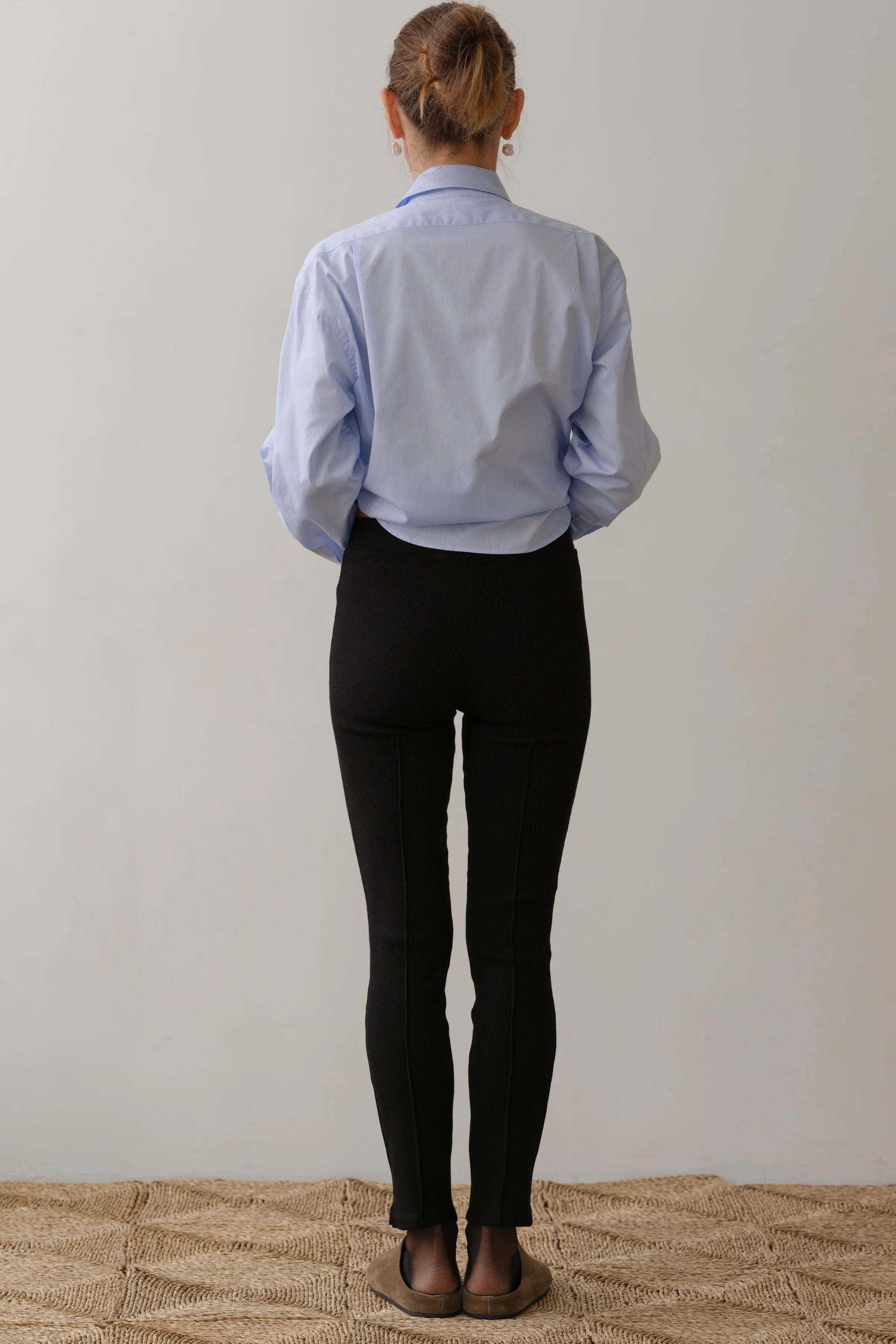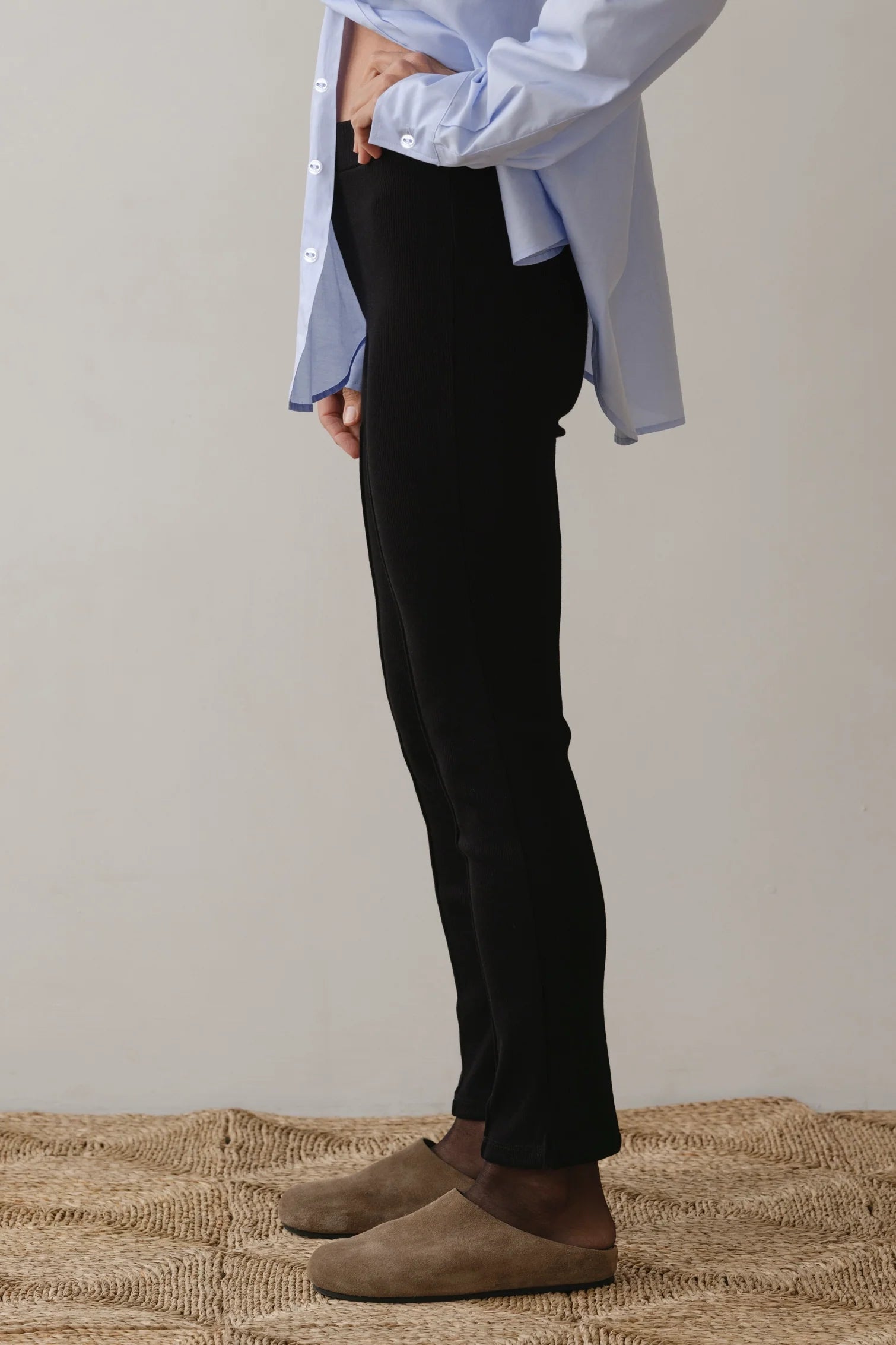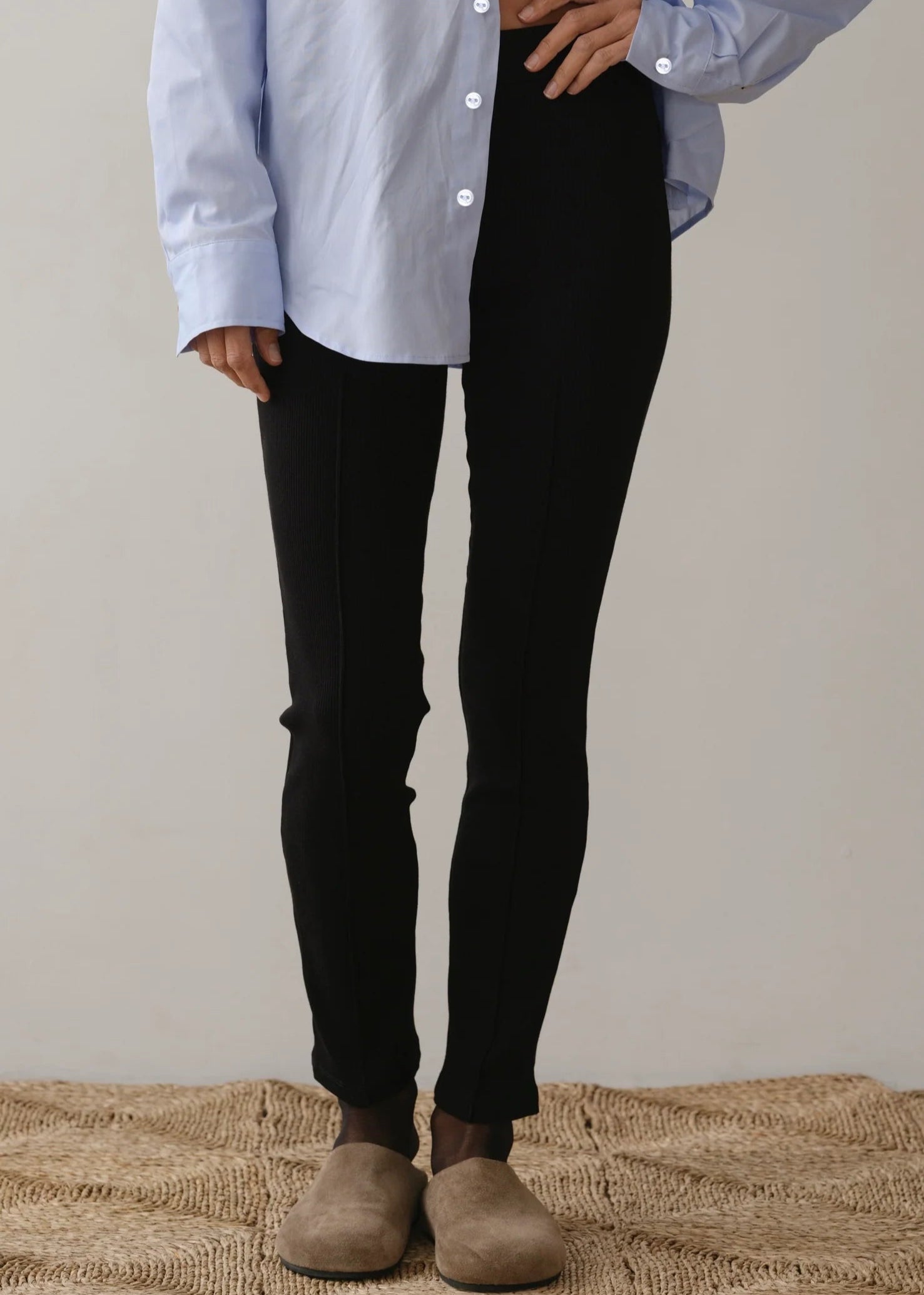 The Rib Straight Leg features pintuck detailing along the front and back, a close fit through the leg, and subtle ankle slits for an elevated finish.