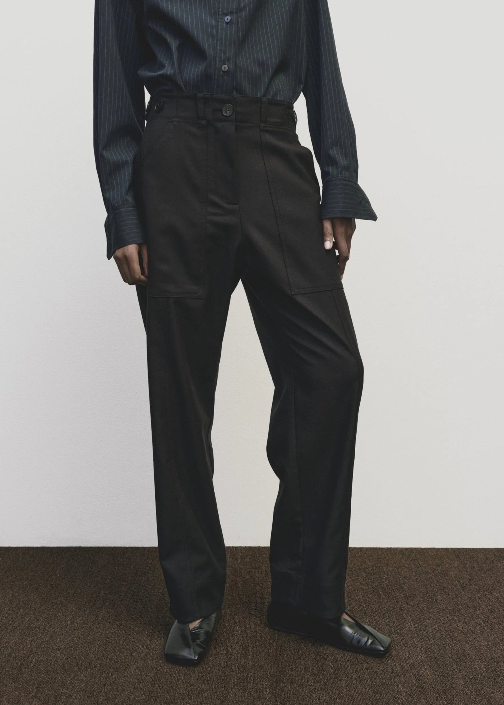 These navy wool blend workwear pants combine comfort and practicality. Featuring stretch fabric for ease of movement, they include a button and zipper fly front, two front patch pockets, and one back patch pocket. The adjustable waist and bottom with button and tap allow for a customized fit, while the unlined design keeps them lightweight and breathable—all designed to help you work comfortably throughout the day.