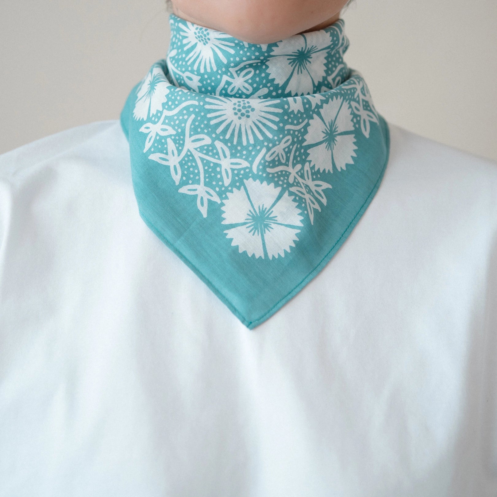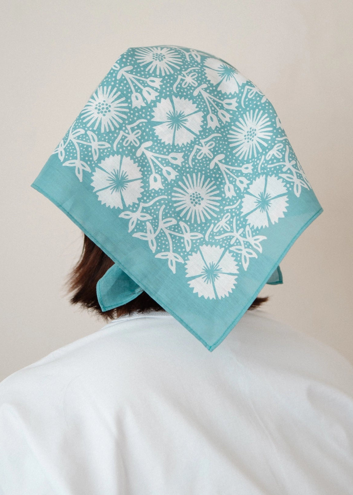 Pennsylvania Dutch Hex Stars inspire the medallion in the center of the Aster bandana, an auspicious symbol that brings luck to daily life and love. Surrounding this blessing is a field of flowers inspired by the Arts and Crafts movement. From the turn of the 20th century, this decorative style was rooted in medieval, romantic, and folk influences.