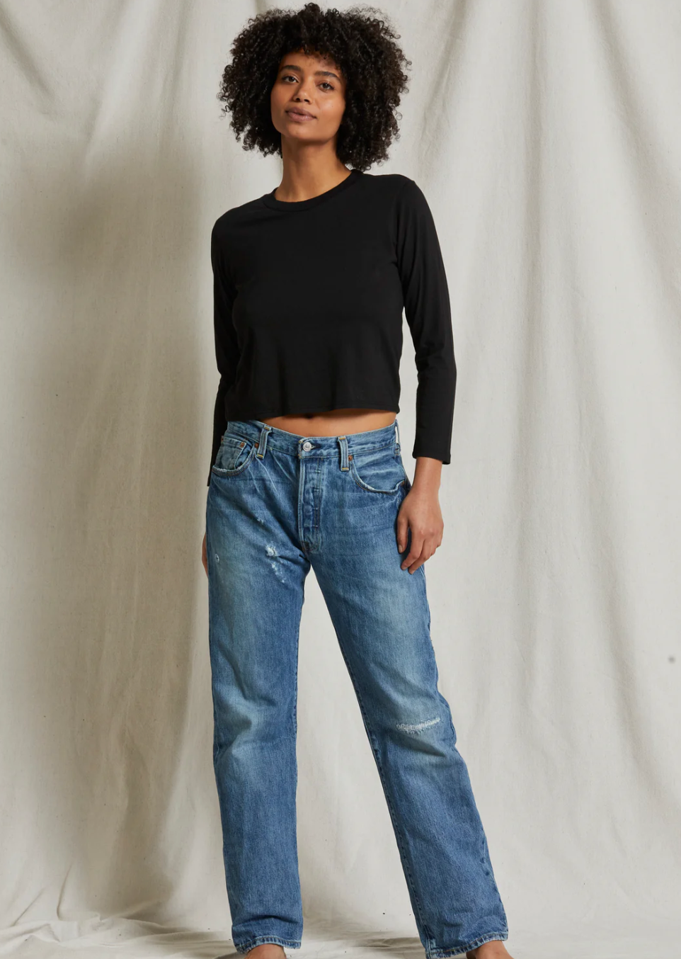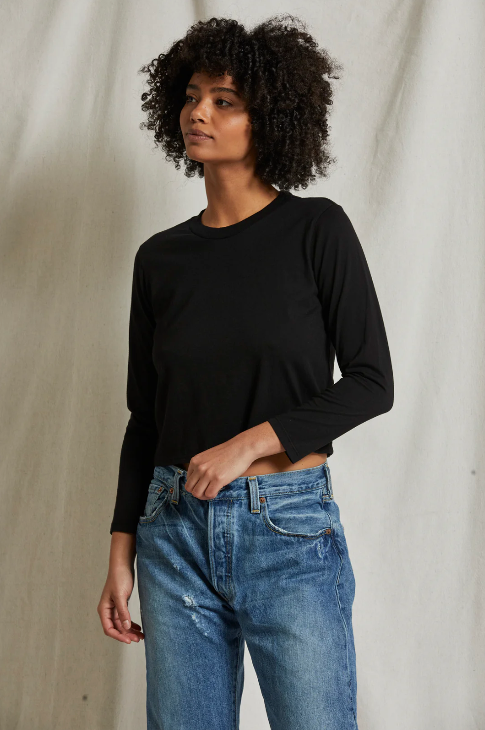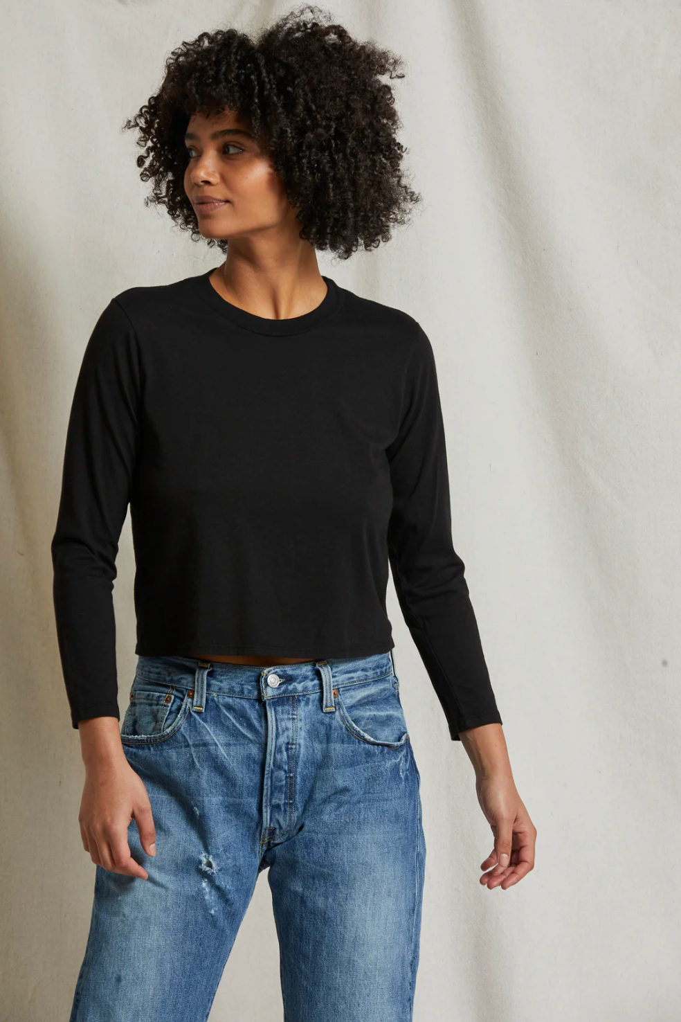 Cut in our soft supima cotton, this long sleeve crew neck tee is the perfect weight to wear all year. Hits at mid waist and features full length long sleeves and a rounded neckline. Fits true to size.
