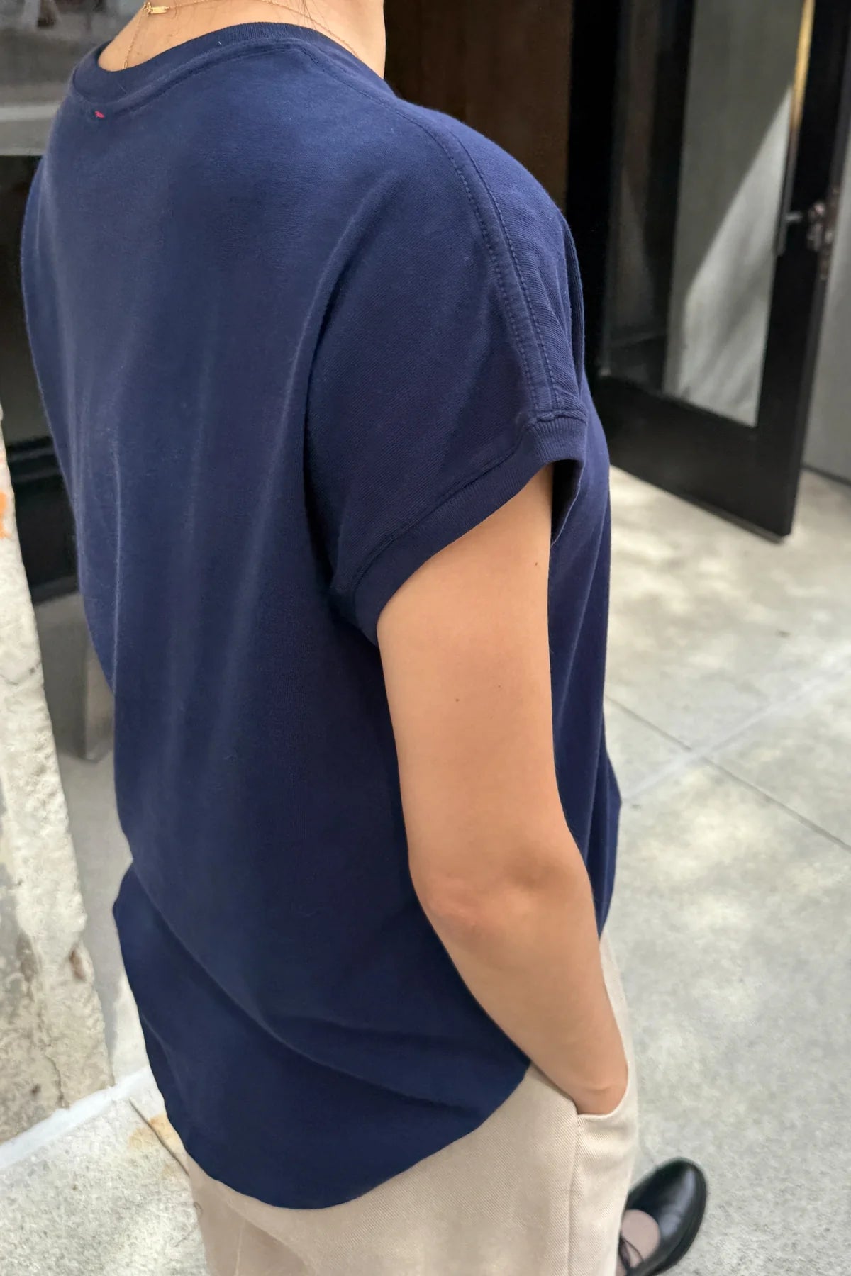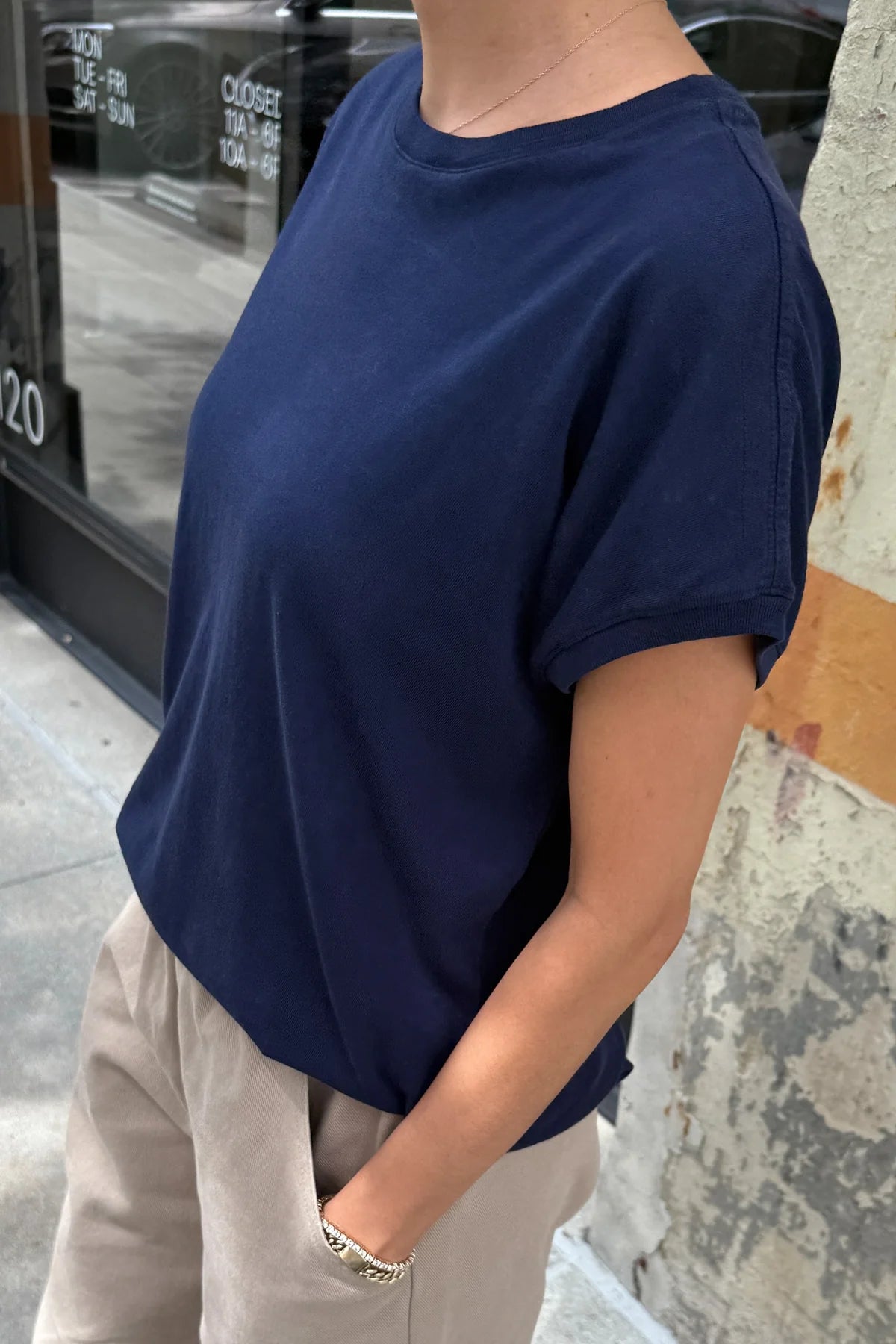 The Ease Tee is an edgy dolman tee. It features a high crew neck, shoulder coverage without a sleeve, slightly rounded hem and a contrast rib banded sleeve opening and neck opening. Enough length to tuck in or out. It's a cool girl's uniform. Super soft, dropped shoulder dolman tee with a relaxed fit.