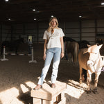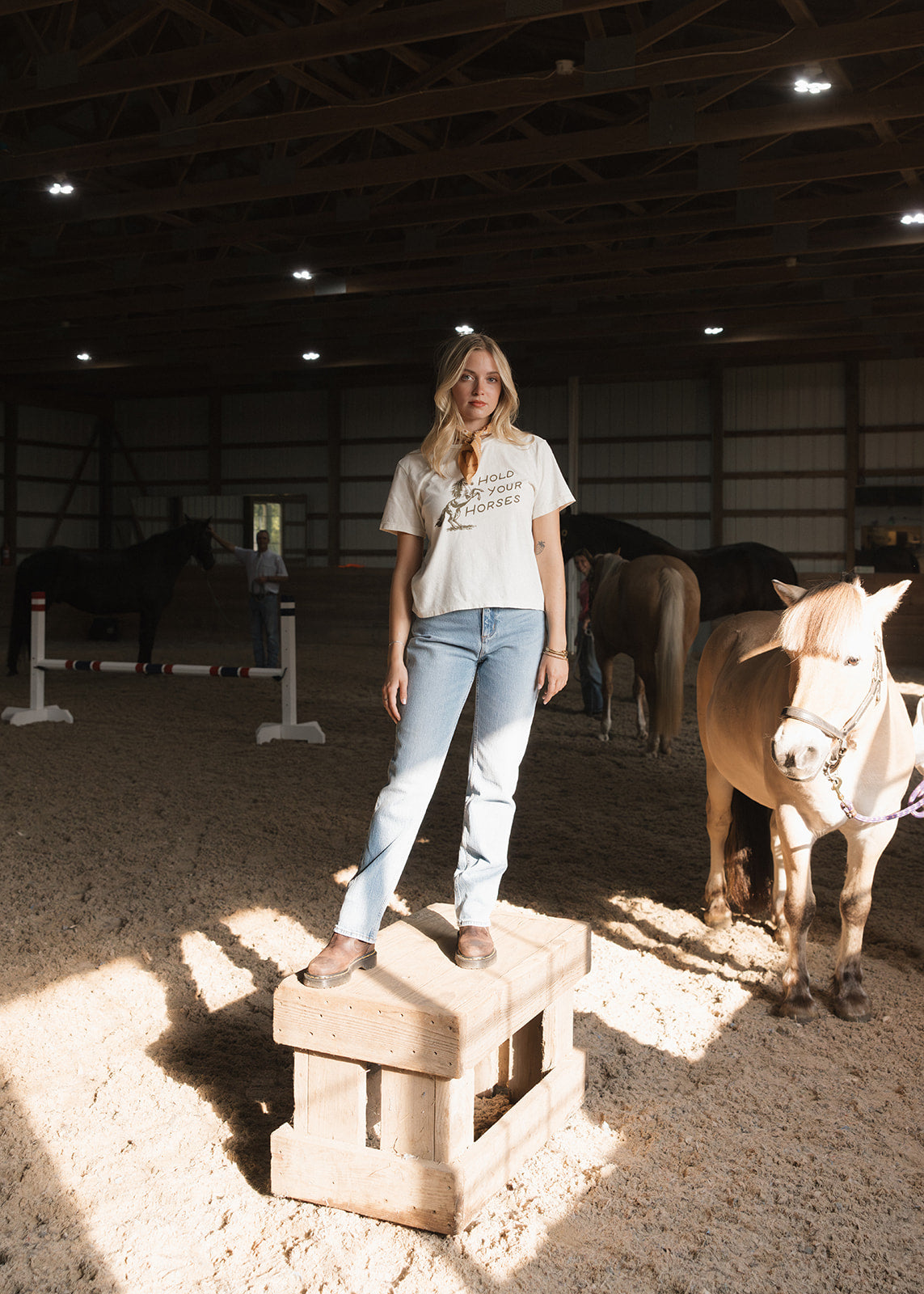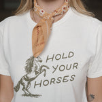 Everyday Boxy Tee blends comfort and style with a timeless fit and soft fabric. Hitting at the denim line, it provides a relaxed, flattering look with just the right amount of ease. The Hold Your Horses tee brings playful attitude with a western vibe.