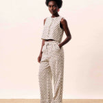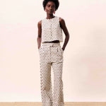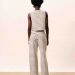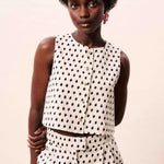 Sleeveless vest with contrasting geometric patterns and button closure.