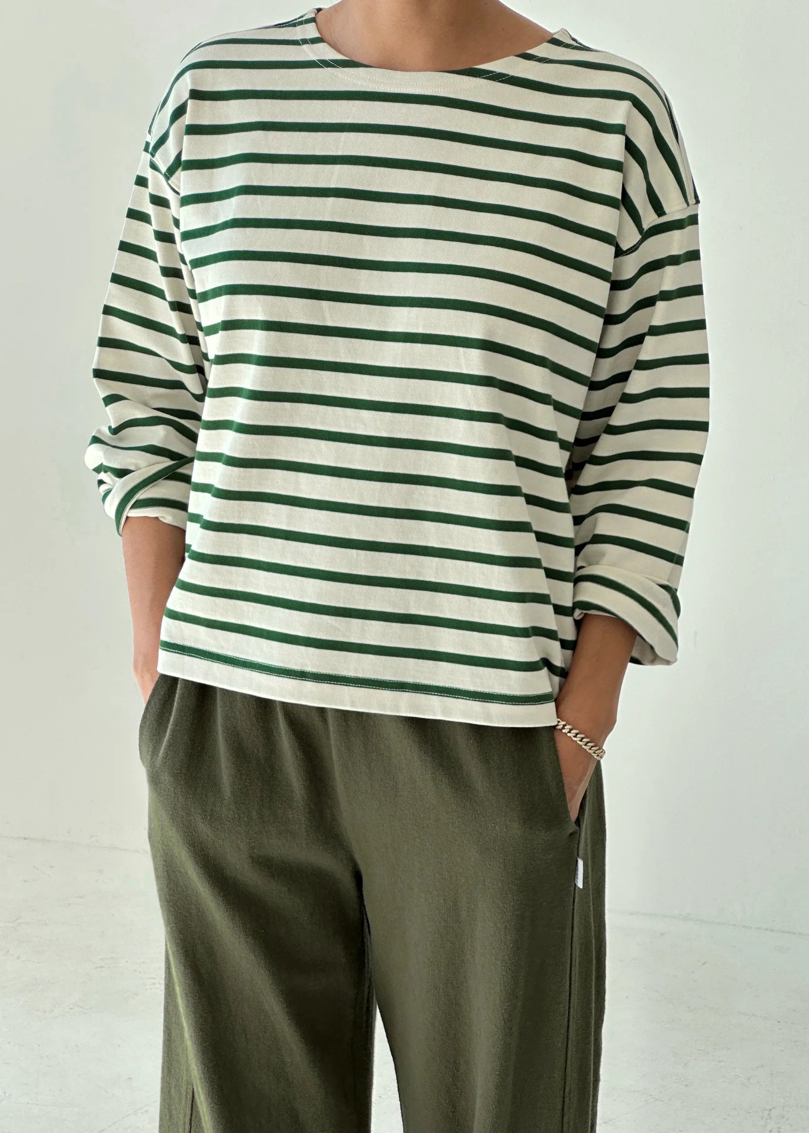A nautical long sleeve with a classic fit. Stripe and boxy shape, but updated with a flattering round neckline and a slightly cropped length that pairs effortlessly with high-waisted bottoms.