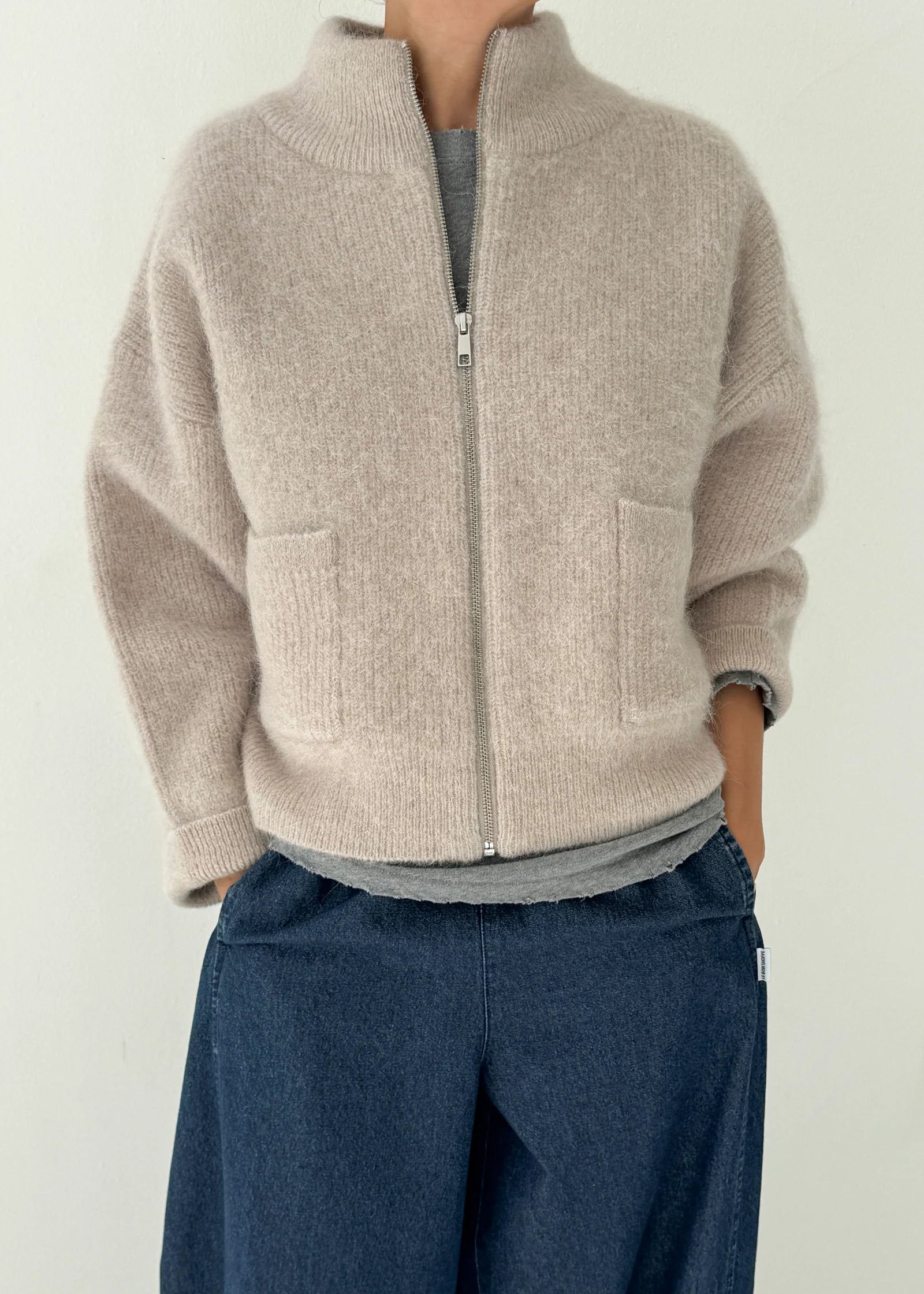 An elevated spin on the classic cozy sweater, the Alpaca Zip Front Jacket is crafted from a soft wool blend with a luxe hand feel. Designed with a mock neck, front pockets, and an easy zip closure, it’s the perfect layer for both relaxed days and more polished looks.