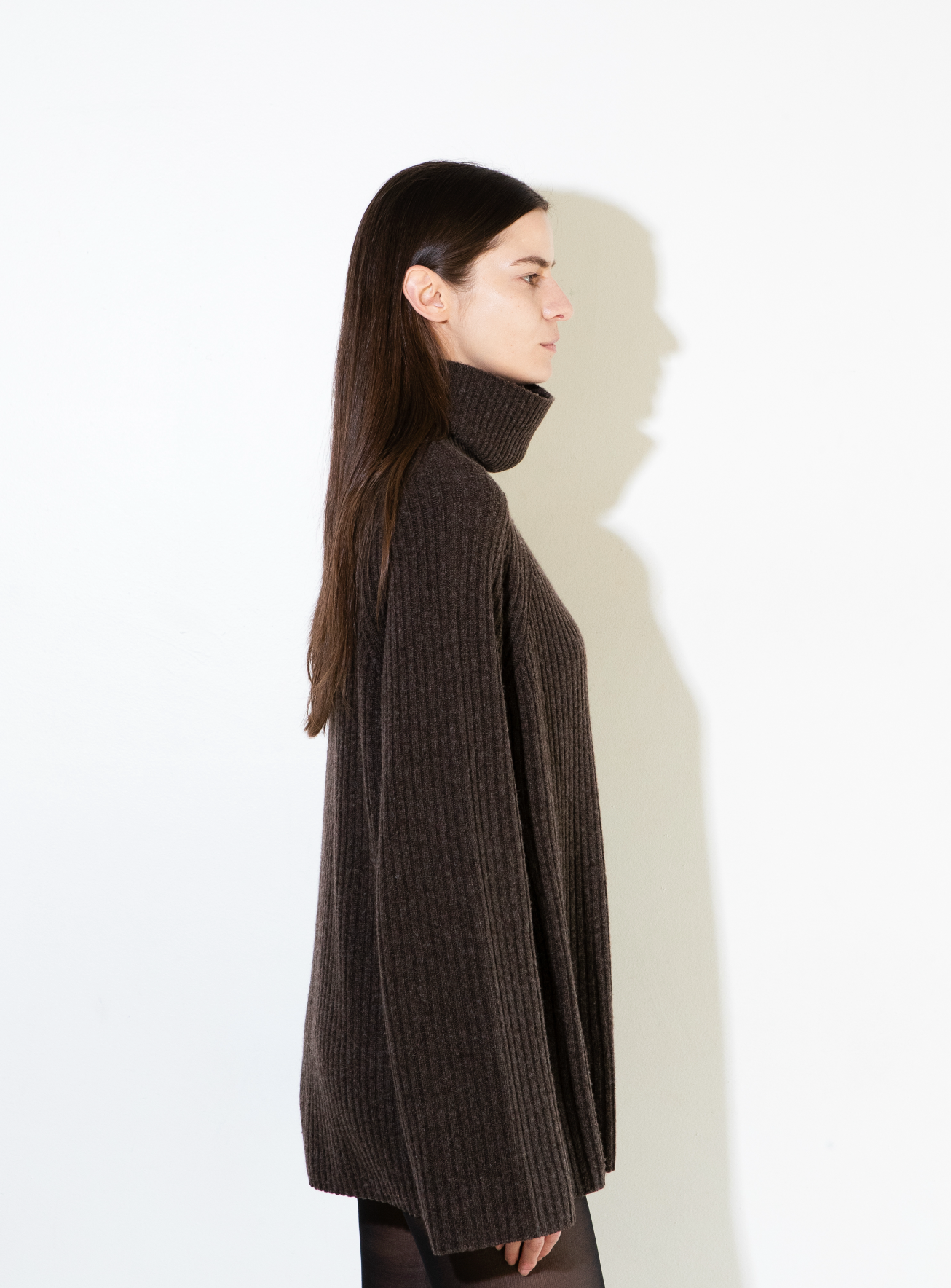 Stay cozy and stylish in this Ribbed Turtleneck sweater in a warm brown shade. Its soft ribbed texture and comfortable fit make it perfect for layering on chilly days or wearing on its own for a simple, classic look.