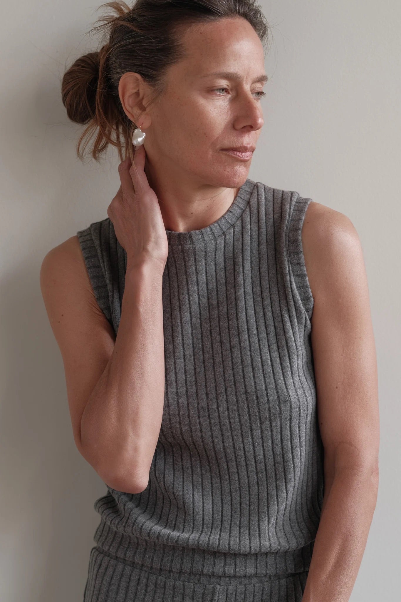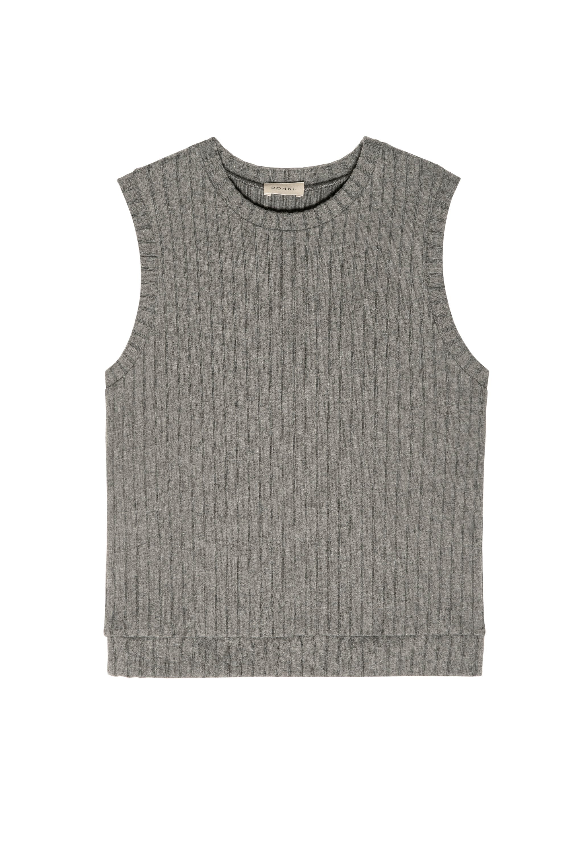 Crafted from ultra-soft sweater rib fabric, this top is made in LA. Designed with a classic crew neckline, sleeveless silhouette, and finished with a banded hem for an elevated touch.