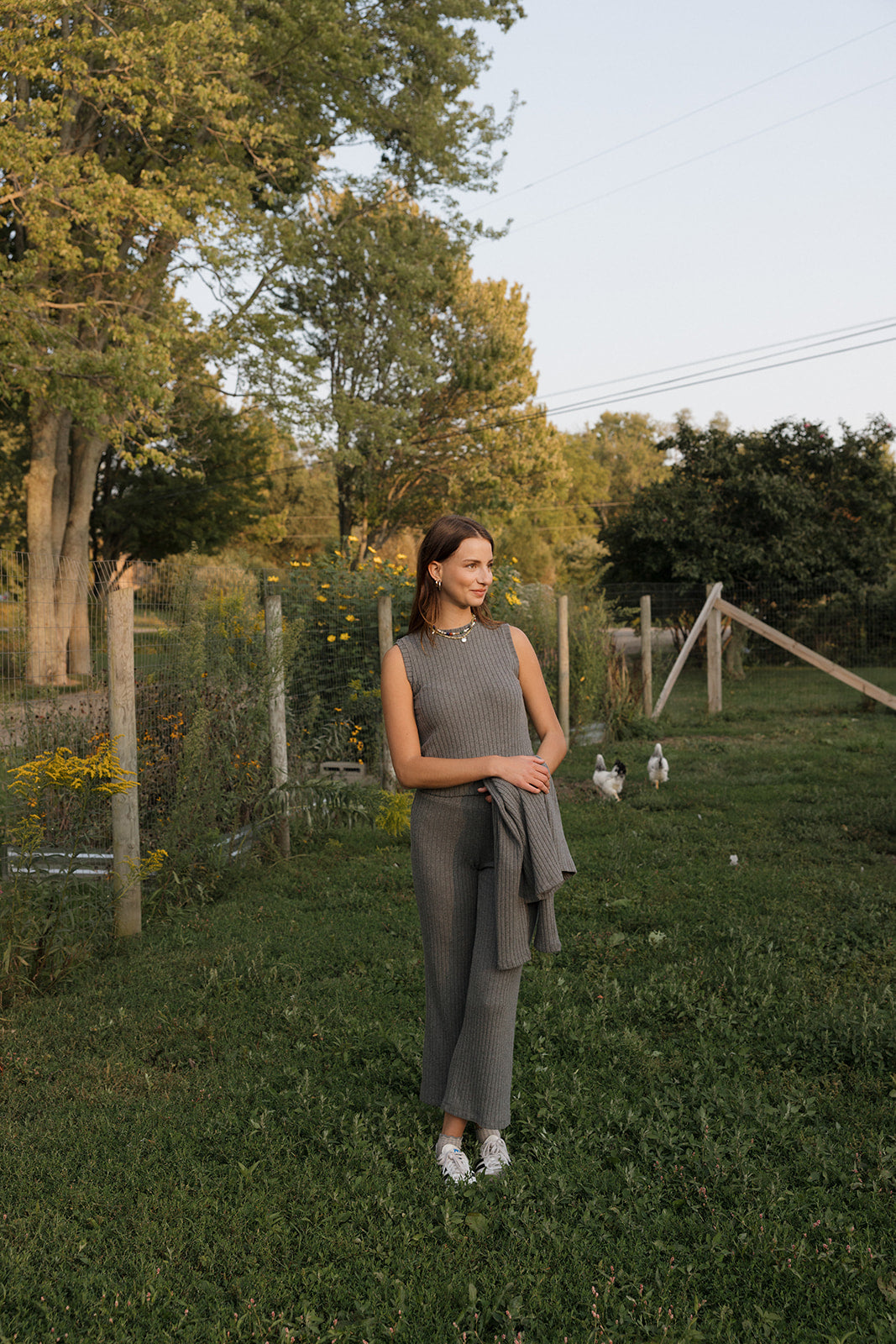 Woman standing in a garden with greenery and a fence in the background