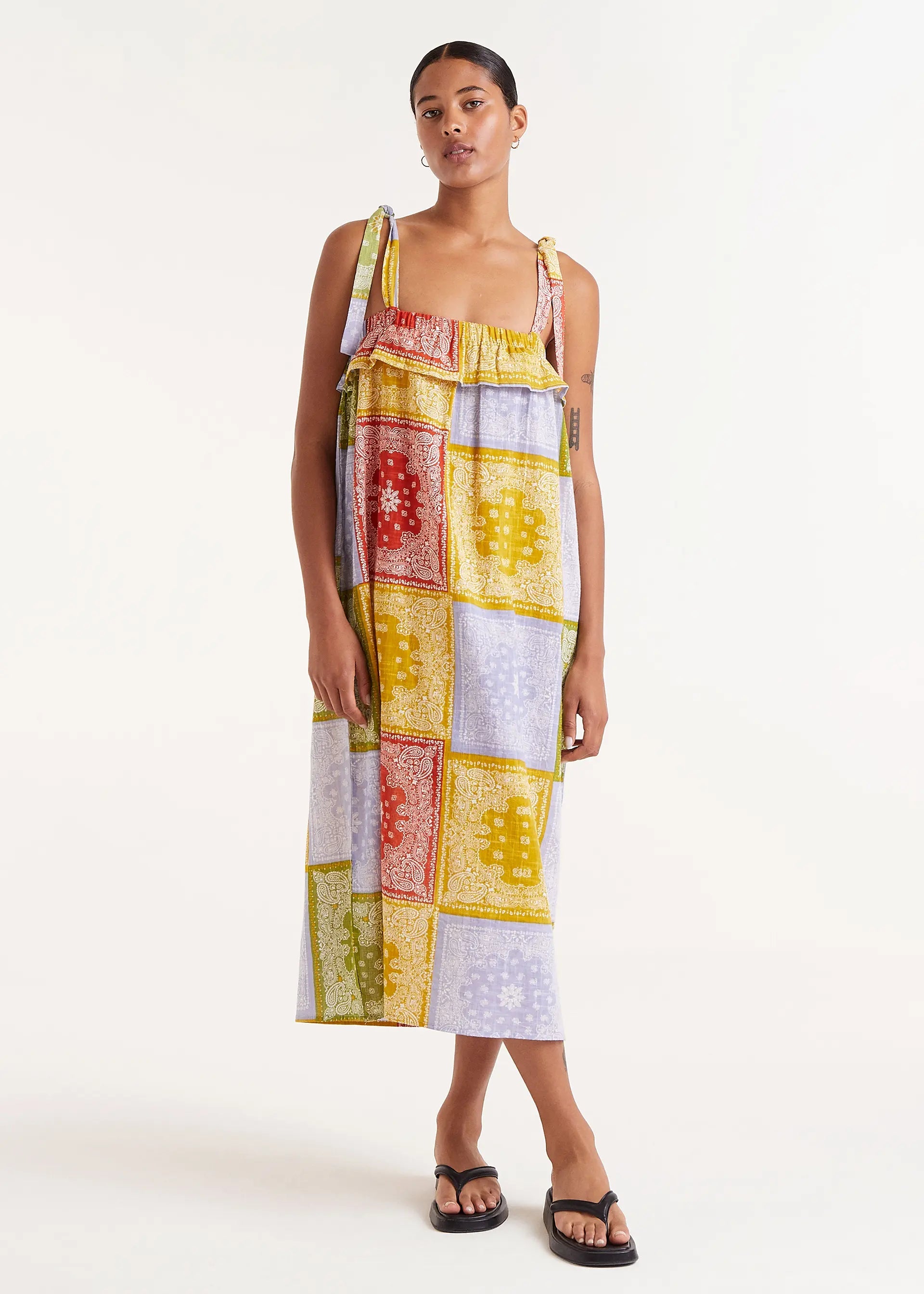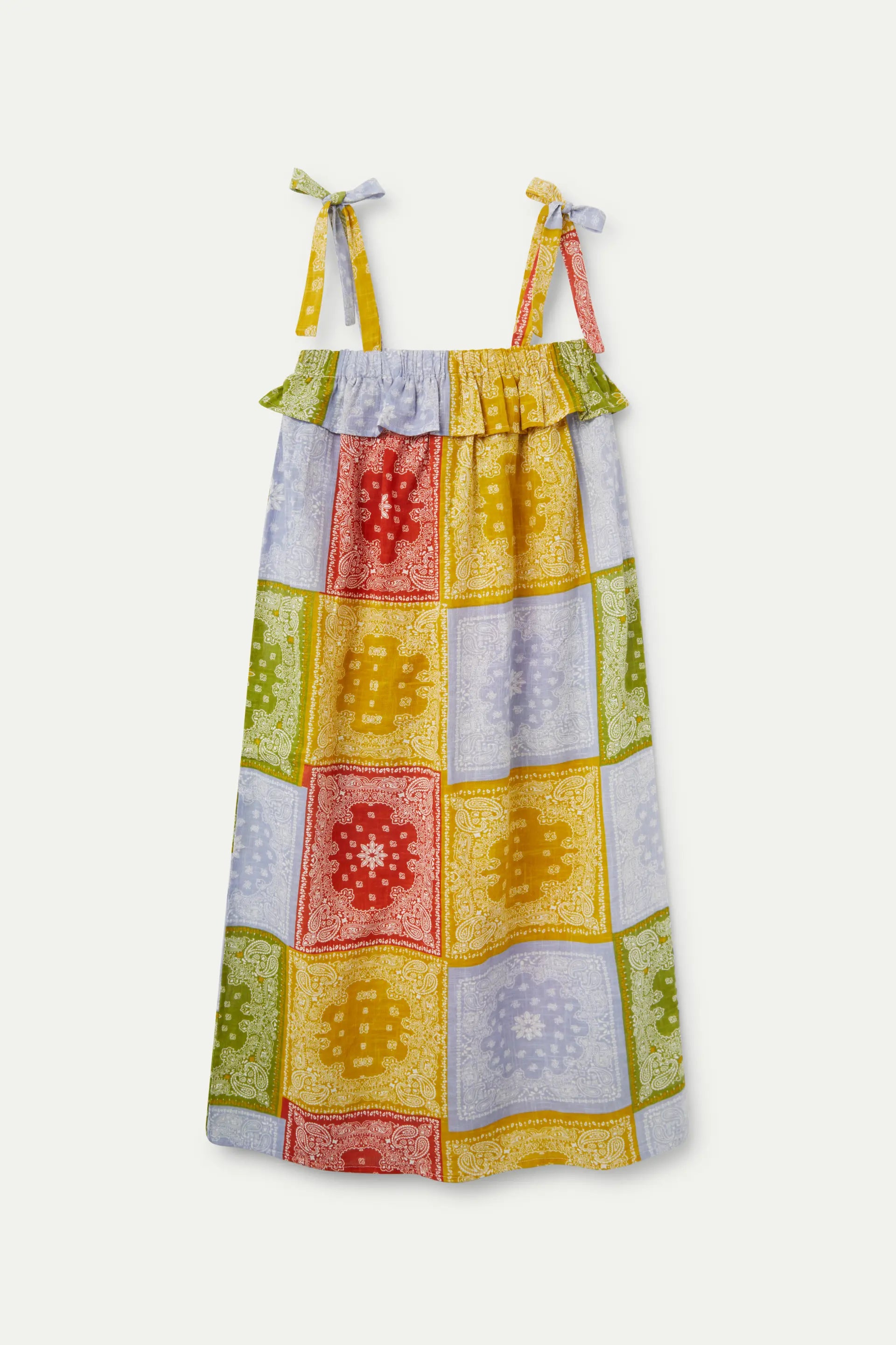 Midi dress in cotton fabric with a pastel paisley print. It features a straight neckline and tie-dye straps. Elastic ruffle detail at the chest.