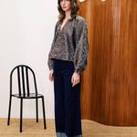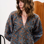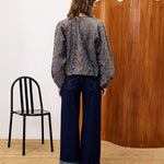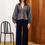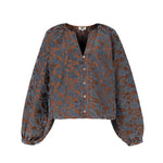 This loose Boldo Blouse in iced brown and blue features long puffed sleeves with tightened cuffs for a comfortable yet stylish fit. Made from textured fabric, it offers a soft feel and subtle visual interest. The V-neck and front buttoning add a classic touch, making it easy to wear for any casual occasion.