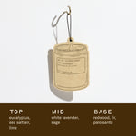 A Car Fragrances with the scent of Big Sur magic, wild sage baking in the sun, the rumble of waves and rocks. Notes of eucalyptus, sea salt, redwood, and palo santo. Meant first for hanging on the rearview mirror, these are also suitable in other small spaces like bathrooms, closets, and more.