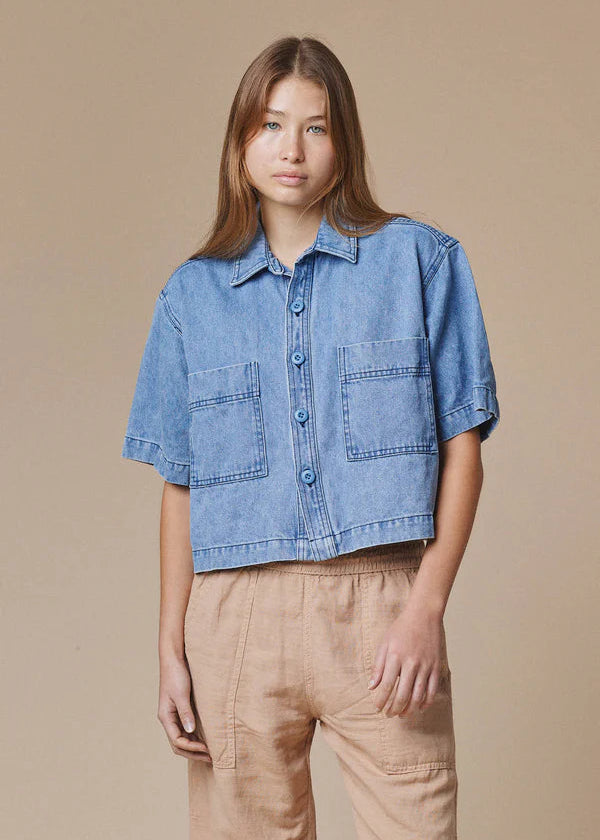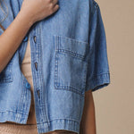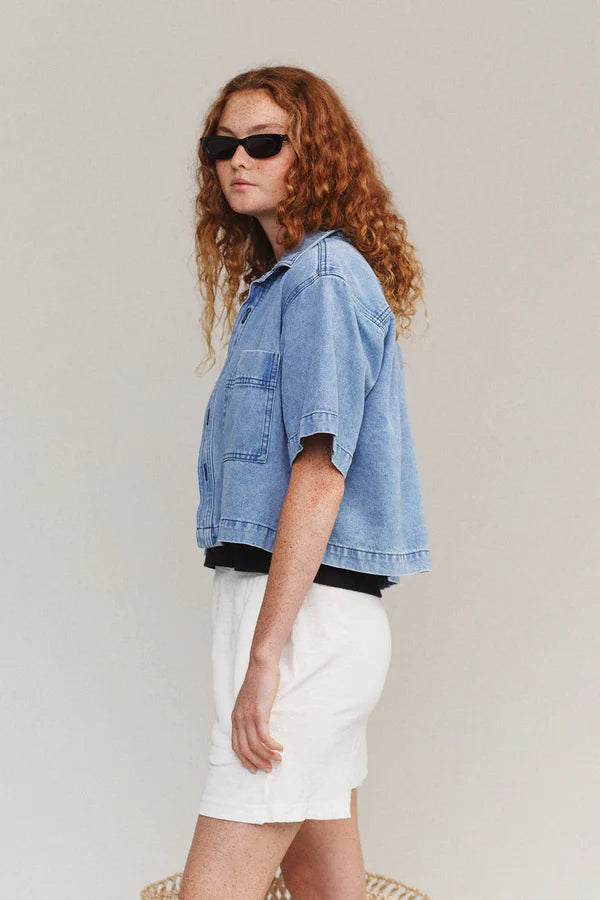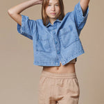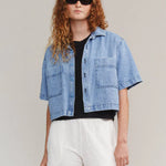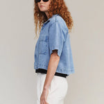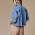 Super boxy, avant-garde shape, this short sleeve top is crafted from soft hemp denim. Its perfect cropped length pairs beautifully with high-waisted bottoms, making it a standout piece on its own or layered over a sleek tank.