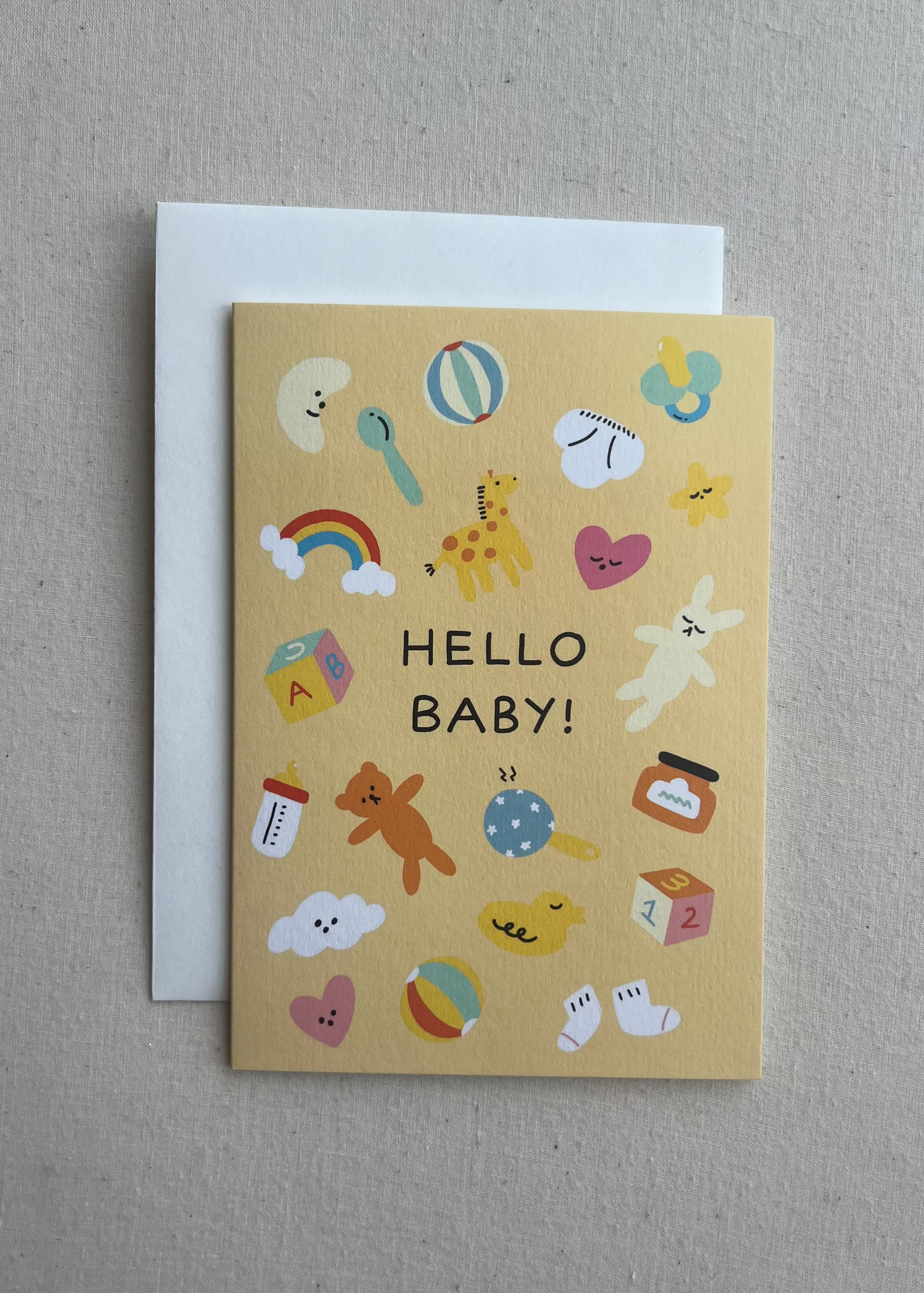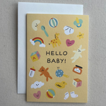 Toys, teddies and hearts all feature on this charming card for new arrivals.