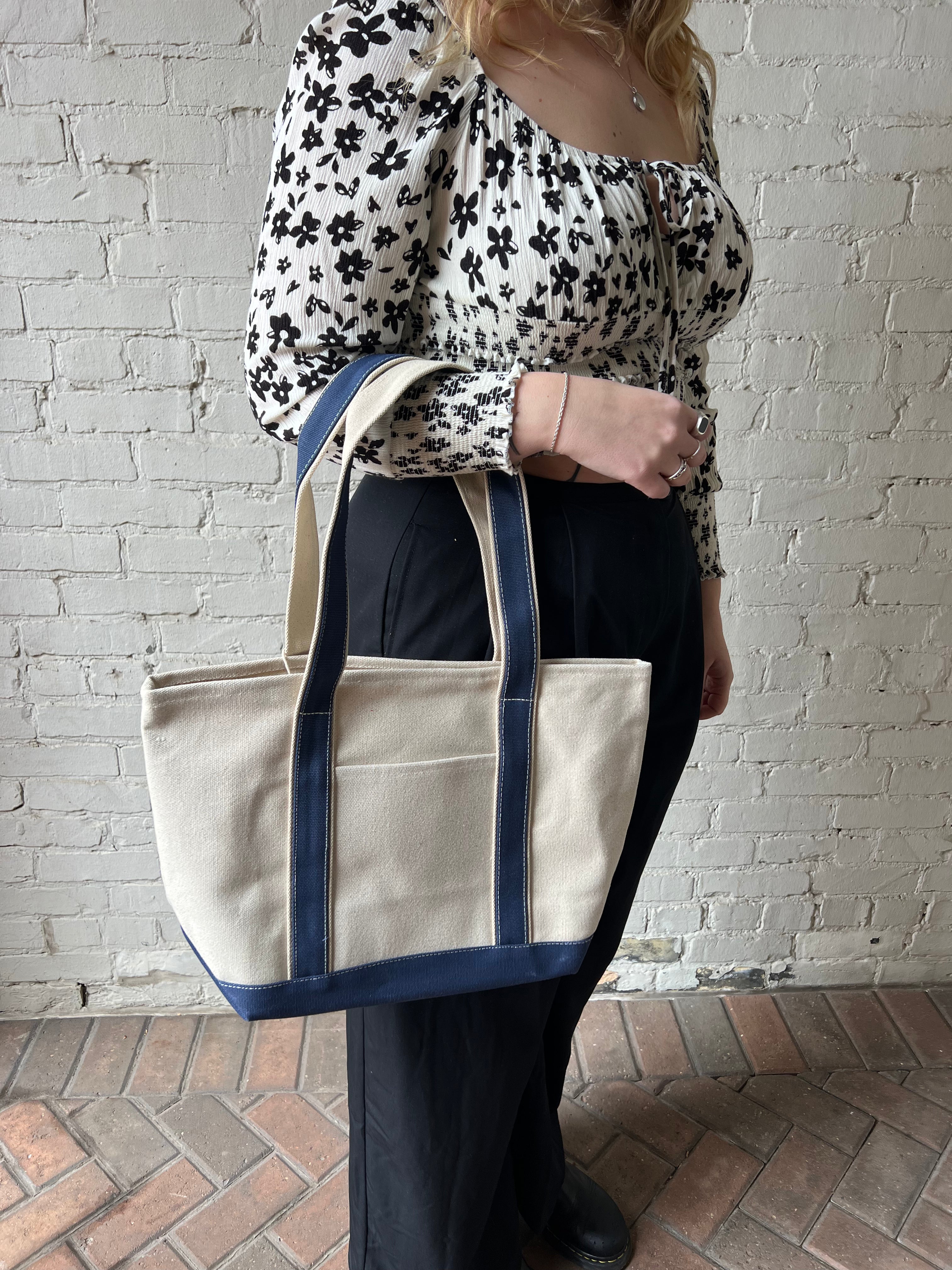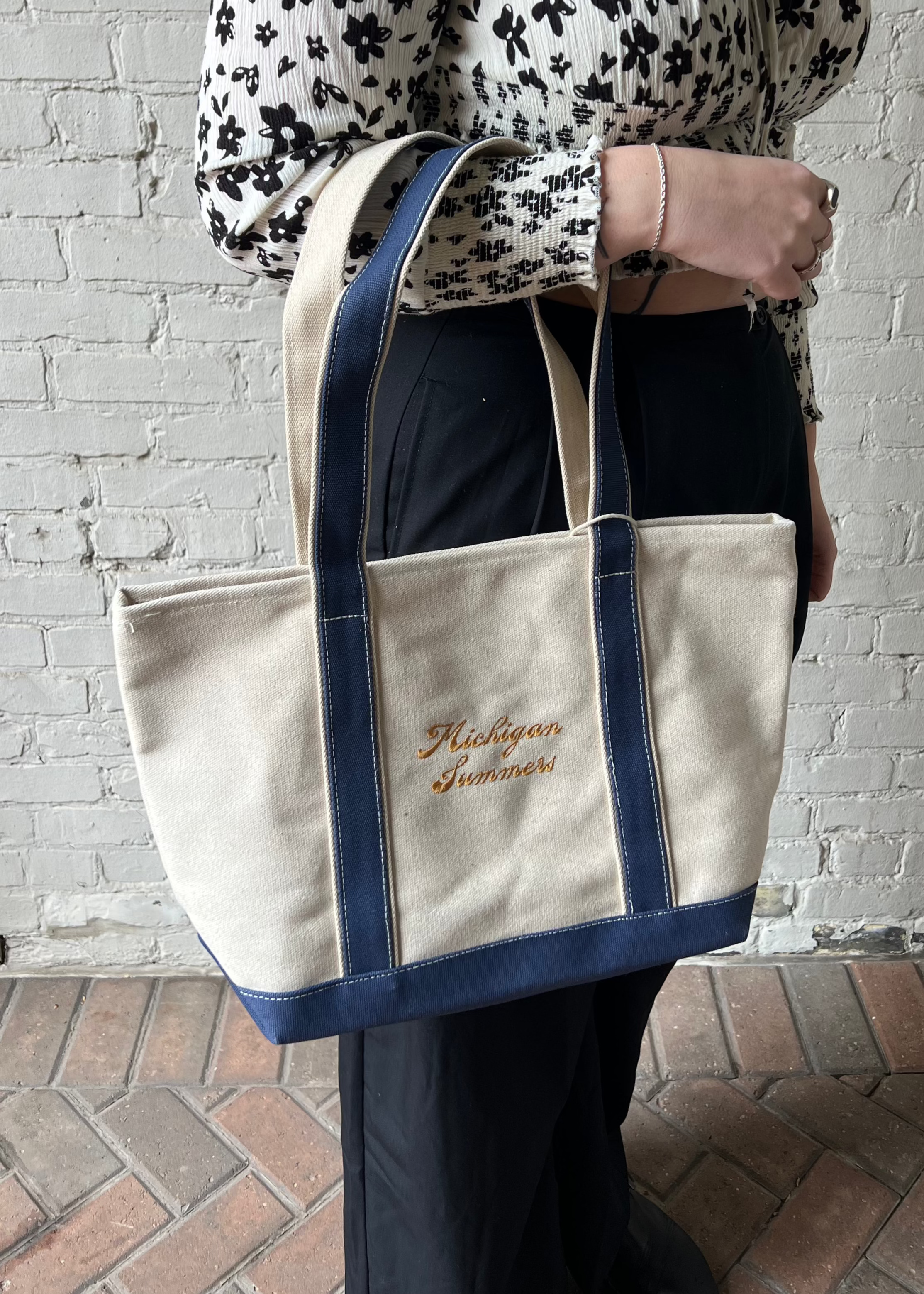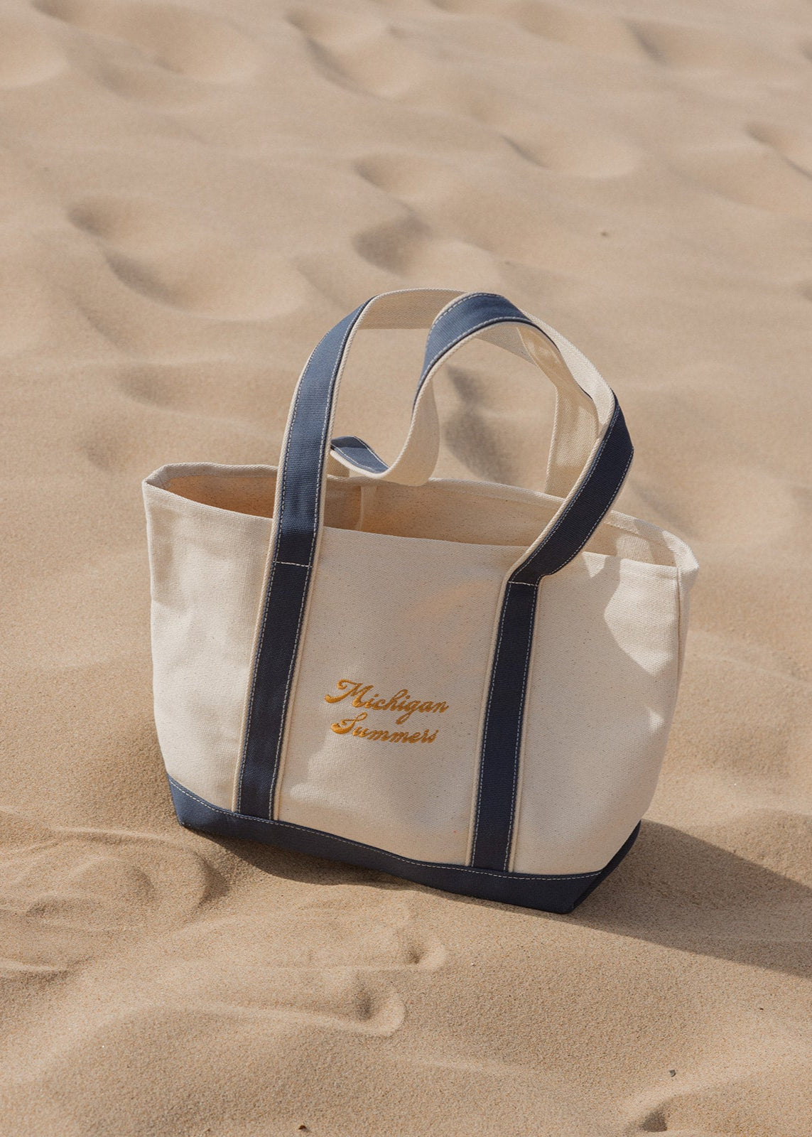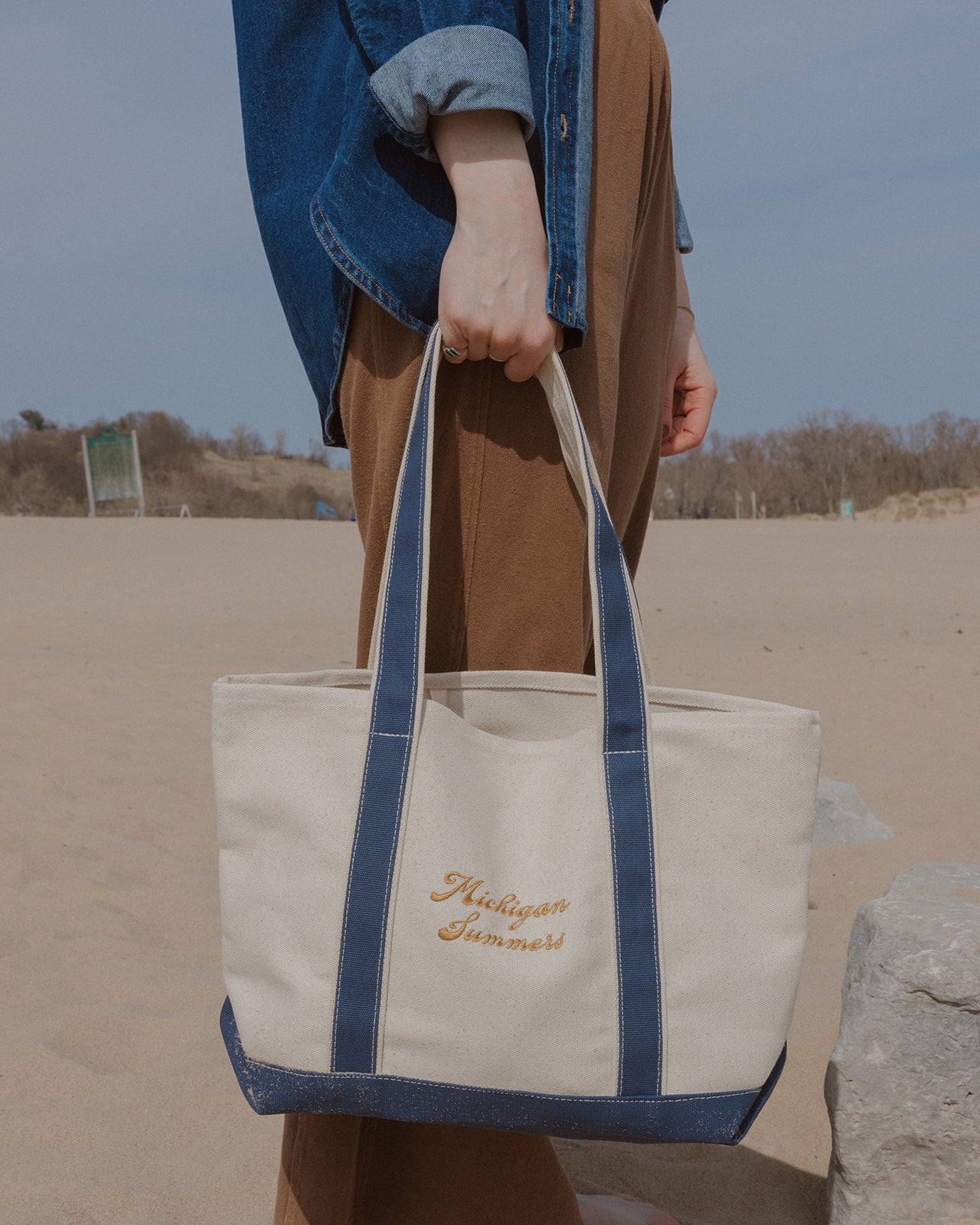 Simplify your lake days with our Lake Michigan Large Tote Bag. Crafted from sturdy canvas, it's designed to hold all your must-haves in one convenient location. Complete with an internal and external pocket, plus an internal key fob for added organization.