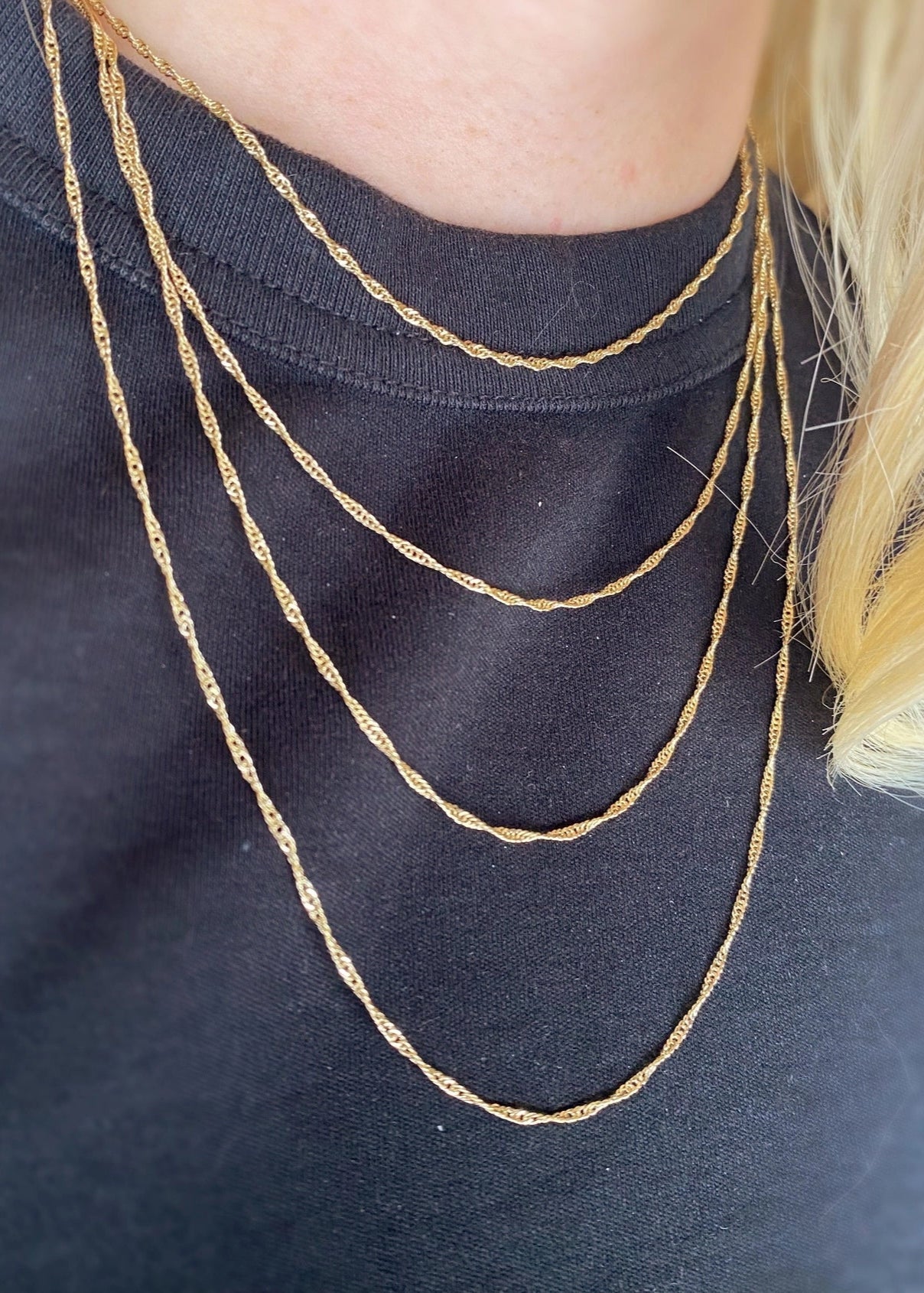 This 18k Gold Filled 1.7mm Singapore Chain offers a touch of elegance and classic beauty. Perfect for displaying your favorite pendant or wearing alone, this jewelry piece is crafted from high-quality gold-filled material that provides a luxurious look and lasting wear.
