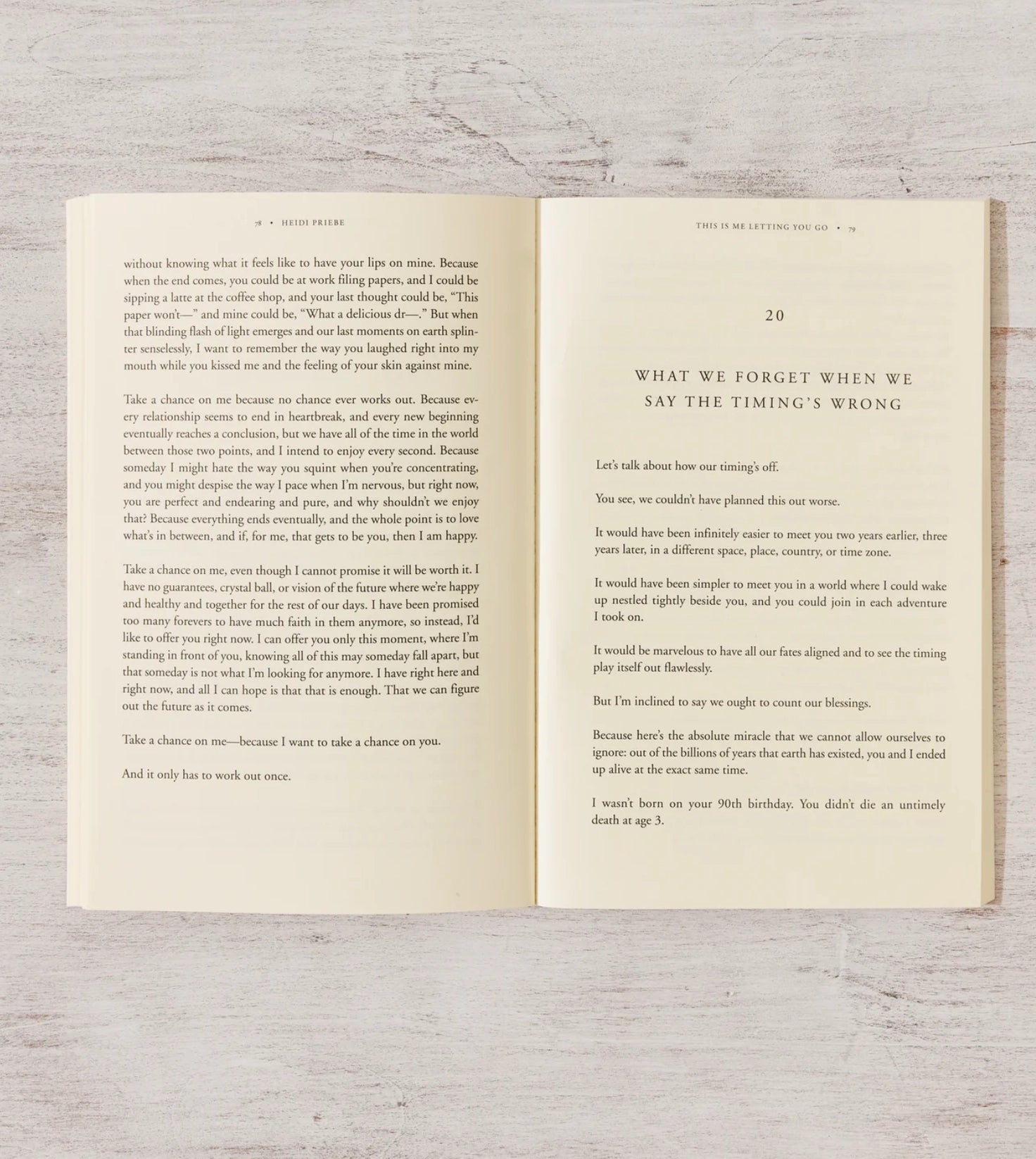 Letting go is not a process that comes naturally to us. In a world that teaches us to cling to what we love at all costs, there is an undeniable art to moving on - and it's one that we are constantly relearning. In this series of honest and poignant essays, Heidi Priebe explores the harsh reality of what it means to let go of the people and situations we love most - often before we are ready to - and how to embrace what comes next.